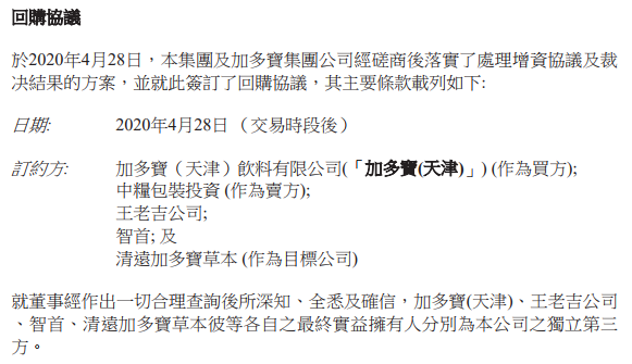 4月28日,中粮包装发布公告,宣布与加多宝集团公司经磋商后落实了处理增资协议及裁决结果的方案,并就此签订了回购协议。