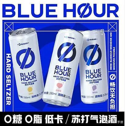 于是,我们看到一些主打 "0 添加,不含香精、色素、防腐剂 " 的低度酒脱颖而出。比如BlueHour推出了0糖0脂低卡苏打气泡酒低度微醺果酒、鸡尾酒;空卡也以0嘌呤、0糖、0代糖作为卖点传播。