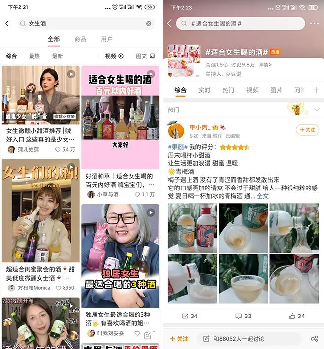 翻开社交媒体,在喝酒这件事上,简直比包包、口红的吸引力都大。小红书有超过 11 万篇与 " 女生酒 " 相关的笔记,微博话题 # 适合女生喝的酒 # 有 1.5 亿次阅读、9.8 万次讨论,抖音这一话题的视频播放量过千万。