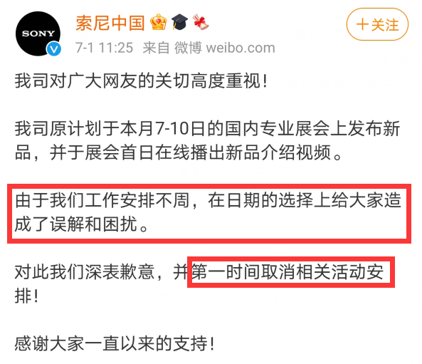 7月1日当天索尼又在微博上道歉,但只是用“工作安排不周”含糊其辞,做了一波毫无诚意的发声。