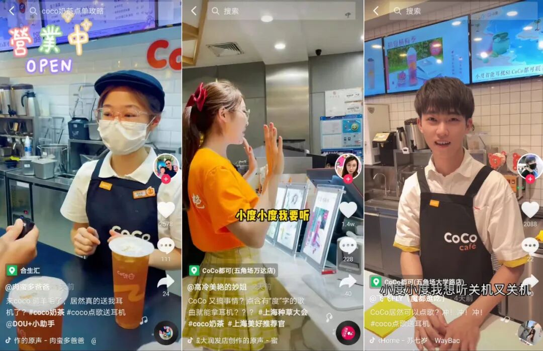 值得一提的是,在这次传播中,小度更是巧妙预埋『到CoCo店点蜜雪冰城,让店员为了完成活动不得不唱歌』的传播桥段,吸引kol和消费者引导店员唱起小度CoCo甜蜜蜜,由此制造调侃同行蜜雪冰城,进一步将『反向社死』的梗玩到极致。这就可以挑动用户整蛊店员的娱乐心理,撬动他们到门店的参与热情。