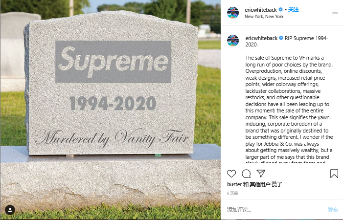 去年VF集团收购Supreme消息流出之后,就曾有死忠粉在网上给Supreme立了一块墓碑,纪念“Supreme已死”。值得一提的是,这个粉丝还曾晒过一件由Supreme小票缝成的T恤,可把我看傻眼了。不难看出,Supreme“高处不胜寒”的饥饿营销策略,再加上慢半拍的商标意识,让Supreme Italia钻到了空子。好在,自2016 年Supreme 将 Supreme Italia 告上法庭,坚持对簿公堂多年,如今Supreme 终于成功打假,大快人心。铁打的Supreme ,流水的山寨品牌,李鬼永远无法成为李逵。山寨固然能捞钱,为赢得眼前的利润,但这并不是品牌的长久之路。