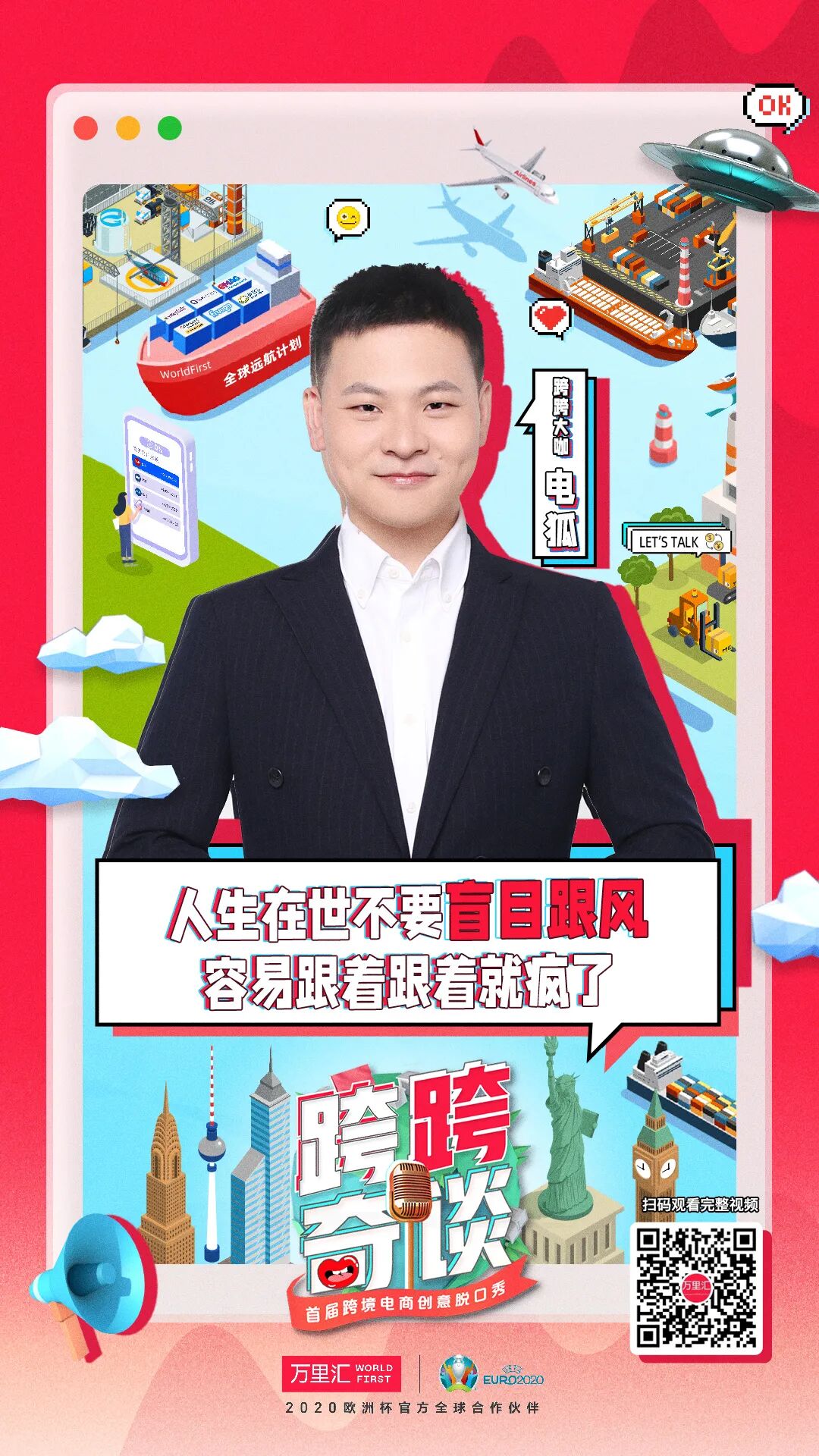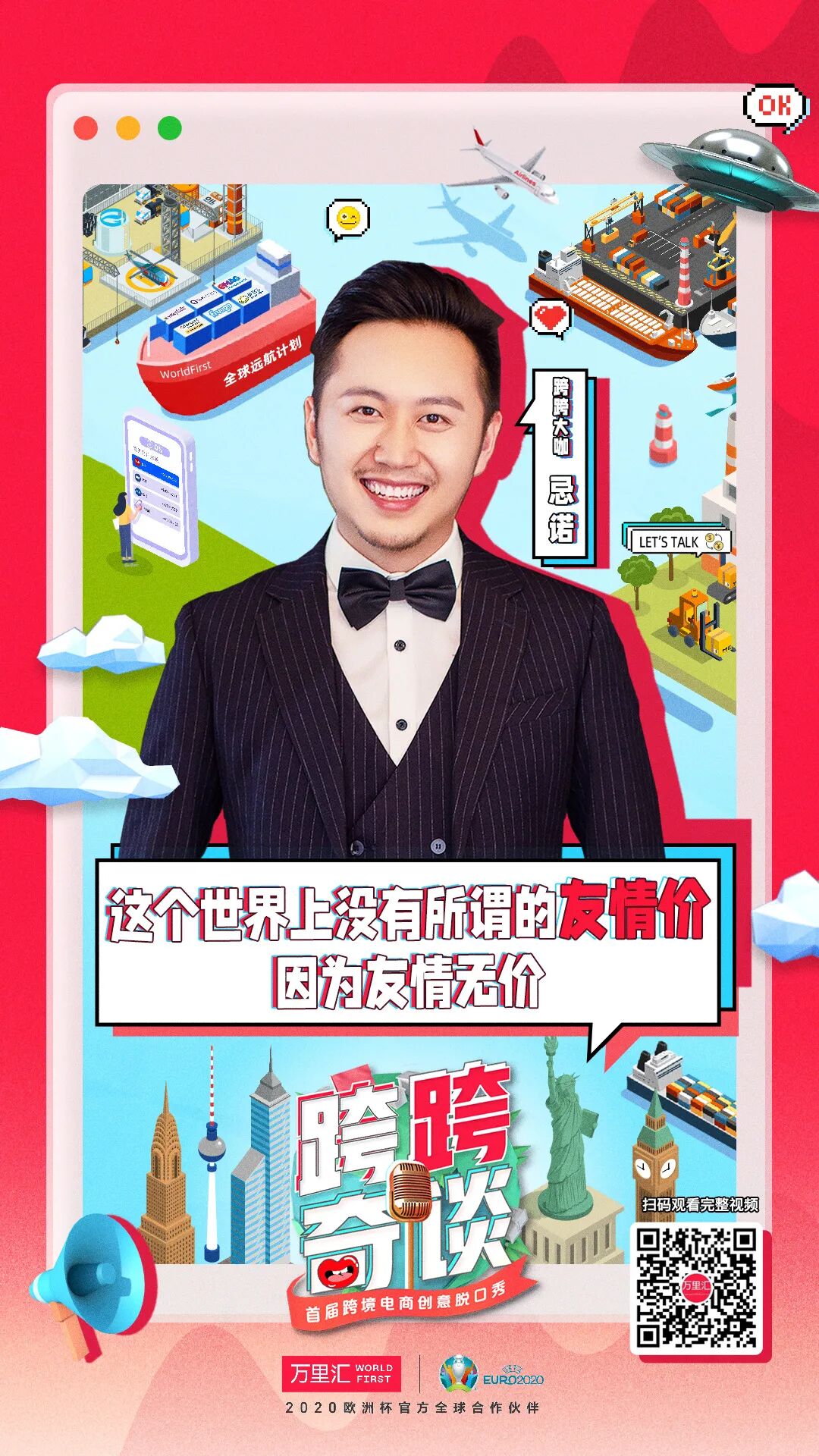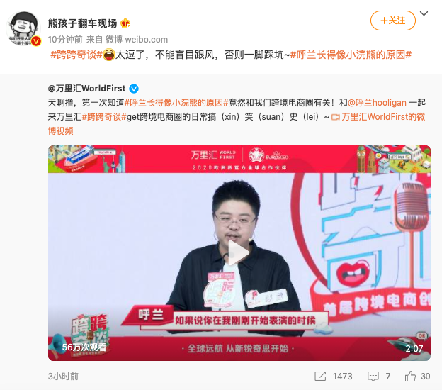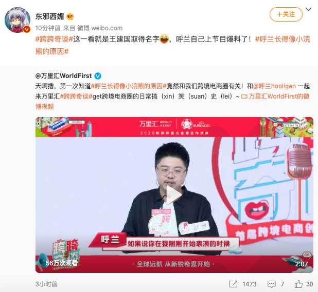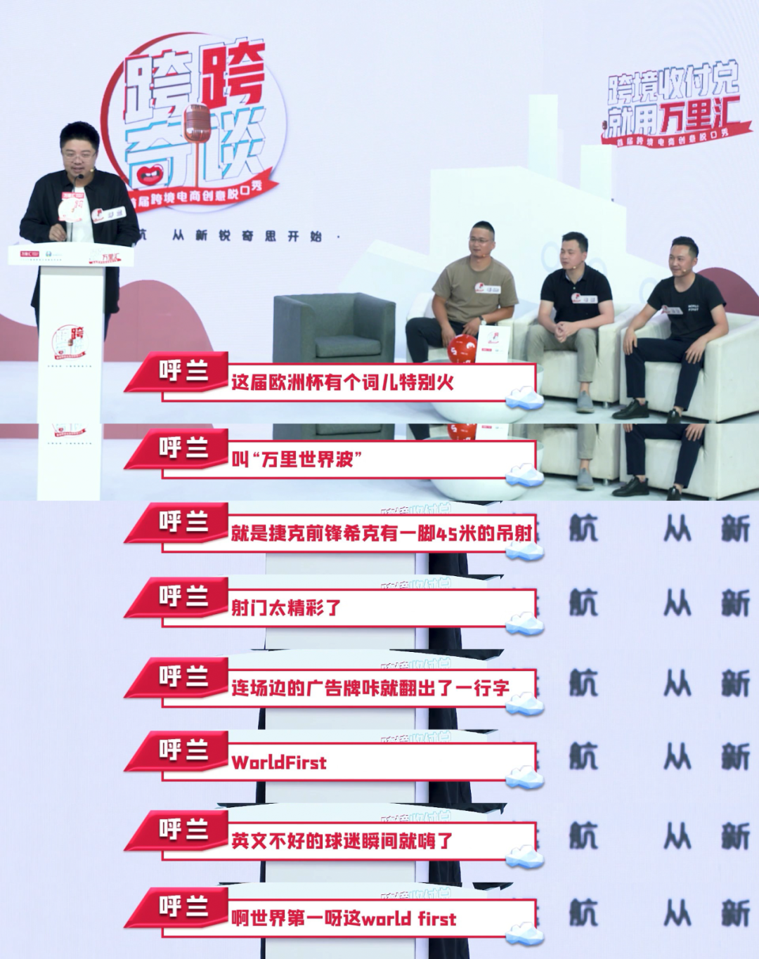其中呼兰老师不愧是脱口秀资深人士,一上来就抓住了谐音梗的精髓,从“WorldFirst”在欧洲杯被外国人误认为“世界第一”,到“跨跨奇谈”的谐音使用像是出自王建国之手,短短几句就让人记住了万里汇(WorldFirst)平台,也对《跨跨奇谈》有了更深的认知。