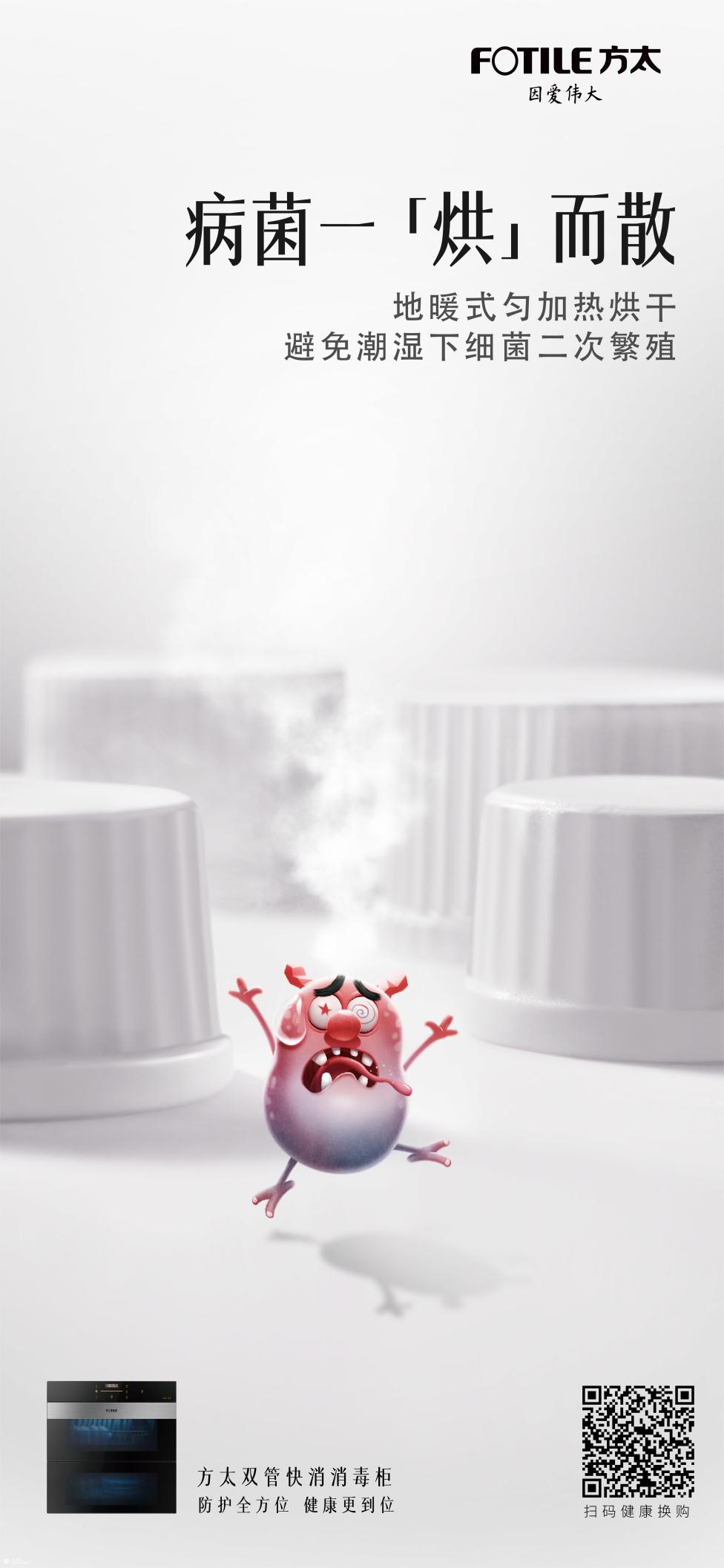 通过疫情期间人们对健康新的思考为背景 从方太洗消产品可以杀灭厨房出现的多种对健康有害物质利益点入手 推出「祝百毒不侵 护万家周全」海报及配套物料 提醒潜在消费者对厨房健康的重新认识 改变对消毒柜和消毒柜的传统消费认知 达到购买的目的
