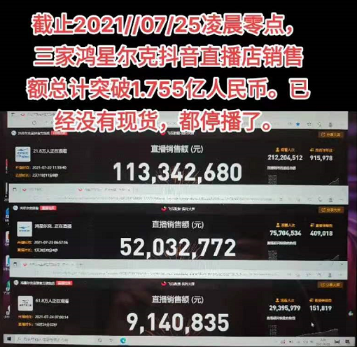 据了解,截至25日凌晨0点,三家鸿星尔克抖音直播店总销售超过1.7个亿,累计观看人次破3亿!