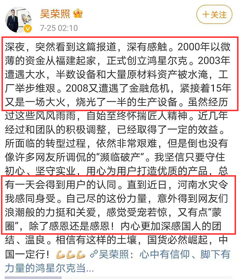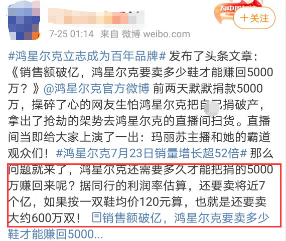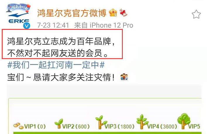 这可把鸿星尔克看傻眼了,发了一条微博立flag:“立志成为百年老店”。