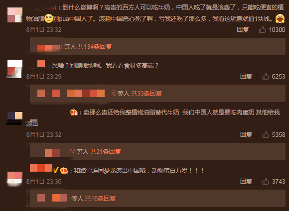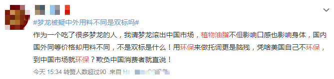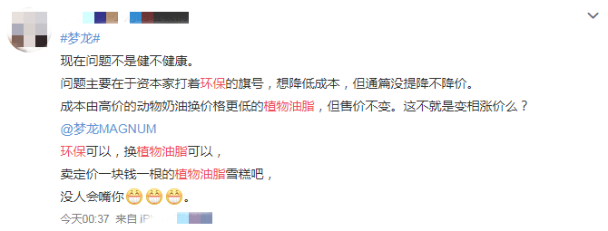 △国外在爱国主义情怀暴涨的当下,很快梦龙的微博沦陷了,几乎所有人都在质问官方:“为什么不使用牛奶,中国人不配吃肉蛋奶吗?”所以,梦龙官微就站出来回应了,直言自己使用了植物油,不是牛奶,也不是植脂末,属于组合型植脂冰淇淋。一石激起千层浪,这不回应还好,一回应骂它的人更多了……因为对于冰淇淋的成本来说,配料表前几位是最关键的。贵一点的冰淇淋雪糕,会选择牛奶(纯牛奶、灭菌乳)+稀奶油为主要成分,便宜一点的会用乳粉、脱脂乳粉、奶油等,甚至是水+糖+植物油。而动辄十几块的梦龙,既然选择用植物油来控制成本,那么就不应该再卖那么贵。因为根据老爸测评的数据显示,它的反式脂肪酸百分比甚至比几块钱的雪糕还高(当然也是合格的)……这就相当于你在奶茶店花20块点了一杯豪华版奶茶,结果给你上的时候,里面却只装了成本3块的清茶……