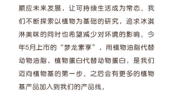 梦龙为了证明自己产品没问题,洋洋洒洒写了一大篇文章科普,说我们这是“梦龙素享”,本来就不是之前的版本,不存在配料不一致。可它偏偏又为了彰显自己“高端”,在后面补充了一段产品理念,说自己用植物油脂不是为了省钱,而是为了环保,减少对环境的影响?就……迷惑,用网友话来说就是:“你那么爱环保,怎么不去捡垃圾呢?”可梦龙就是头铁,非在每一个提倡用植物蛋白代替动物蛋白的品牌都被群狙过之后,把这个标语给打出去了。以至于一开始大家只是吐槽它性价比货不对价,不建议购买。但现在已经发展到希望它滚出中国市场的程度了,这篇“澄清稿”也在舆论压力下而被迫删除……希望现在这些雪糕品牌在疯狂涨价的同时,也能做好品控,要知道,消费者不是傻子,说得再好听,做得不好也总会有翻车的一天……