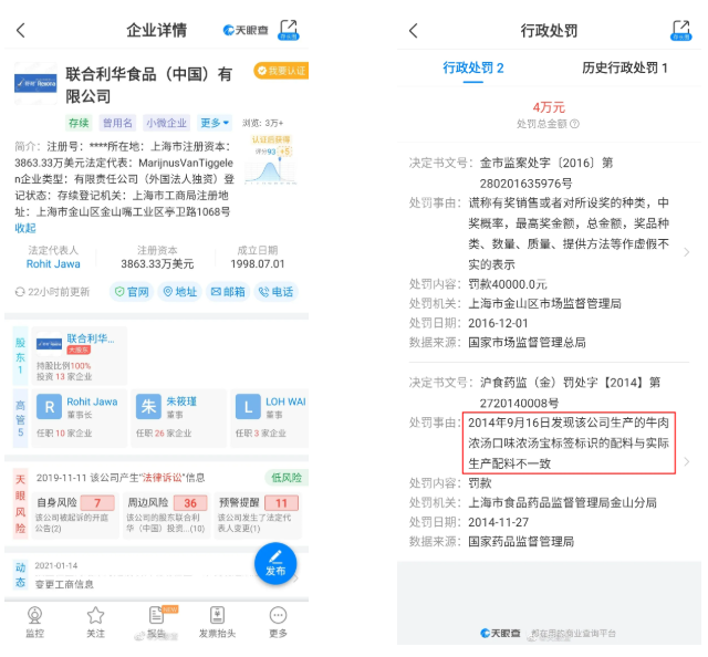 等到网友扒出,“薅消费者羊毛”和路雪不是第一次做的时候,就更气愤了。因为根据天眼查显示,联合利华食品(中国)有限公司之前就曾因生产的产品“标签标识的配料与实际生产配料不一致”而被行政处罚过,这回明显属于是屡错屡犯。
