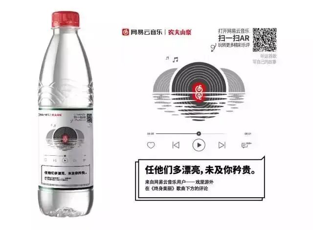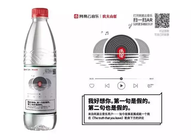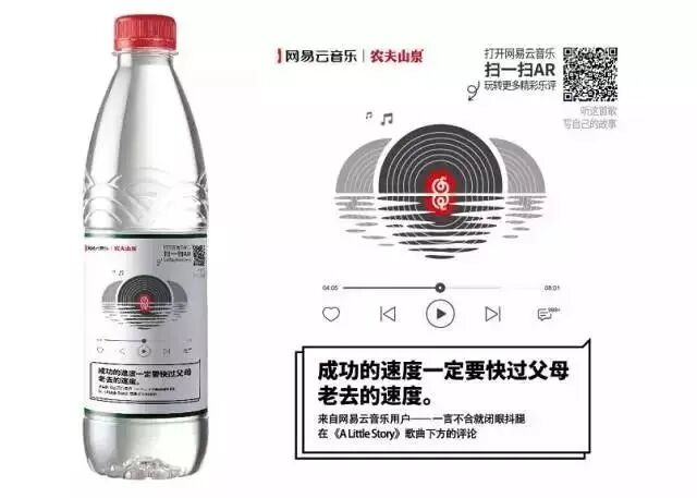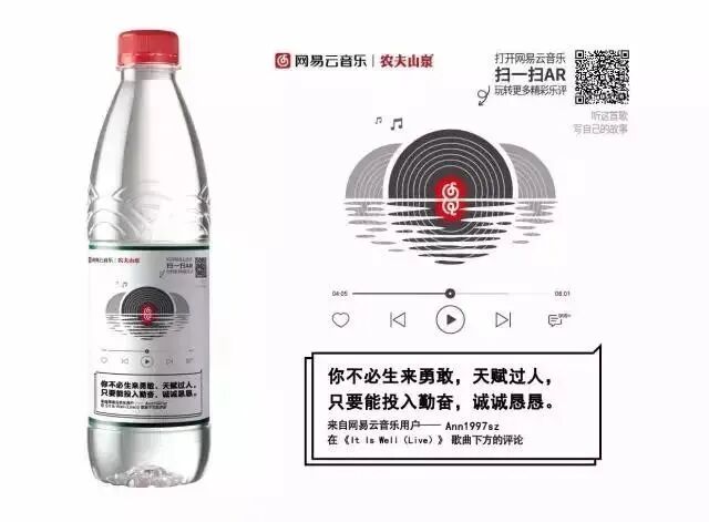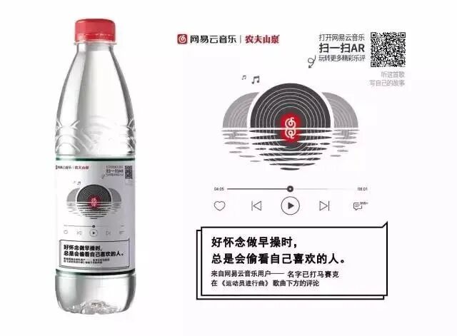 “每一首歌都是一瓶水,只有喝水的人才知道其中的冷暖滋味。”2018年,农夫山泉与网易云音乐合作,精选30条用户评论,印制在4亿瓶农夫山泉包装上,让每一瓶水都自带音乐和故事。