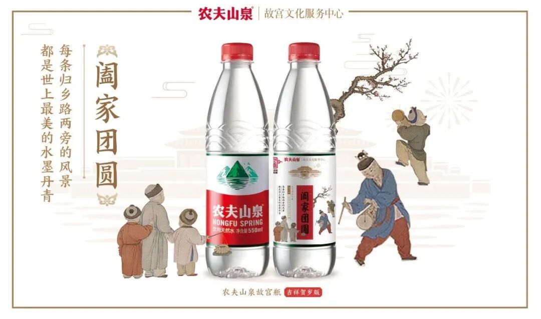 精美别致的画面,配以戏谑有趣的文案,为我们勾勒出了一个又一个鲜活的皇帝嫔妃形象。以往谈起帝王妃子,总有种尊贵而遥遥不可及的距离感。农夫山泉这些“故宫瓶”文案却告诉我们,宫殿里的人也和我们一样,有着平凡人的小温情和小烦恼,瞬间将这种距离感拉近了。己亥猪年即将到来之时,农夫山泉与故宫再次联名,以“家”为情感轴,强势推出了14款贺岁版故宫瓶。这些瓶身将放鞭炮、穿新衣、收红包等传统年俗一一呈现在了消费者眼前。红火的年俗图画,配合走心的文字,满满都是温情。
