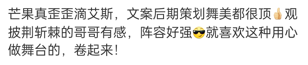 除了哥哥们话题不断外,芒果的开场文案也被网友称为百万文案。故事里说