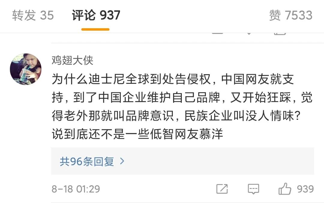 还有人说网友太双标,迪士尼全球到处告侵权,中国网友就支持,到了中国企业维护自己品牌,又开始狂踩,觉得老外那就叫品牌意识,民族企业叫没人情味?说到底还不是一些低智网友慕洋。