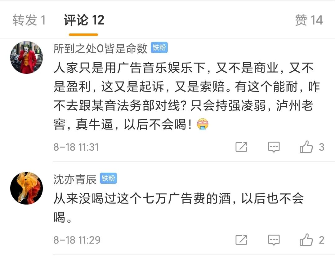 有网友认为,不是有意使用,就是娱乐而已,泸州老窖只会恃强凌弱。并表示以后不会喝了!