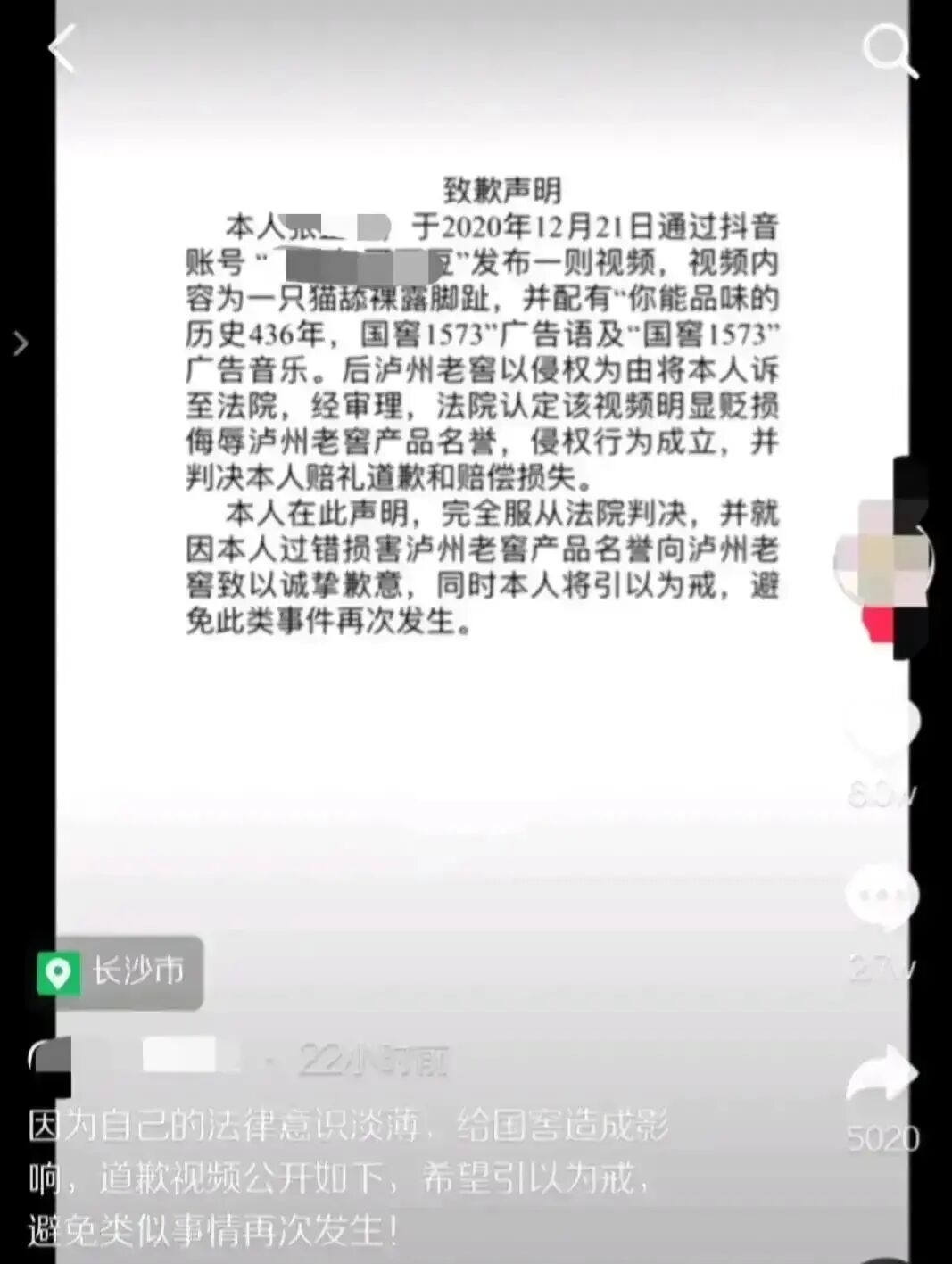 大意就是一女子发布了一条猫舔脚趾配泸州老窖广告配音的恶搞视频,结果被泸州老窖告了,而且赔了7万块。