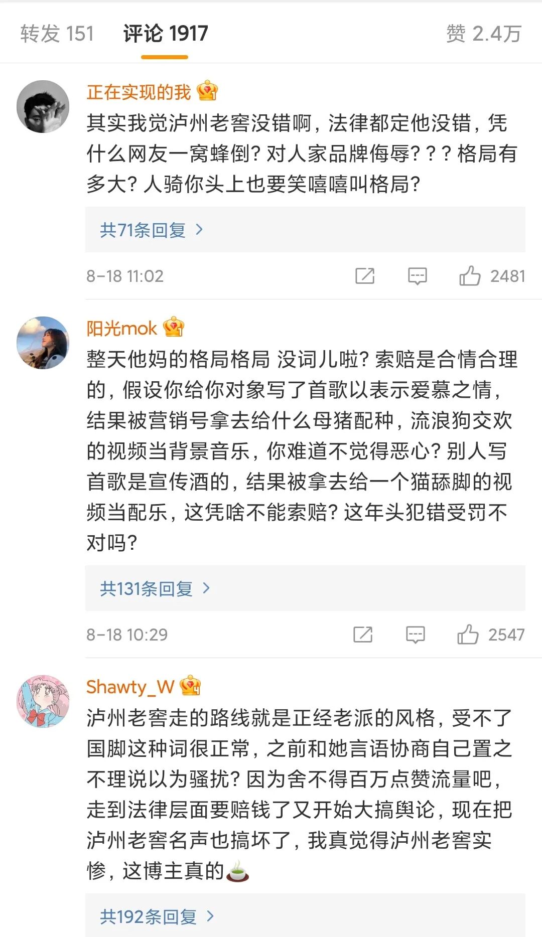 还有网友调侃现在都不敢评论泸州老窖,担心被告侵权。