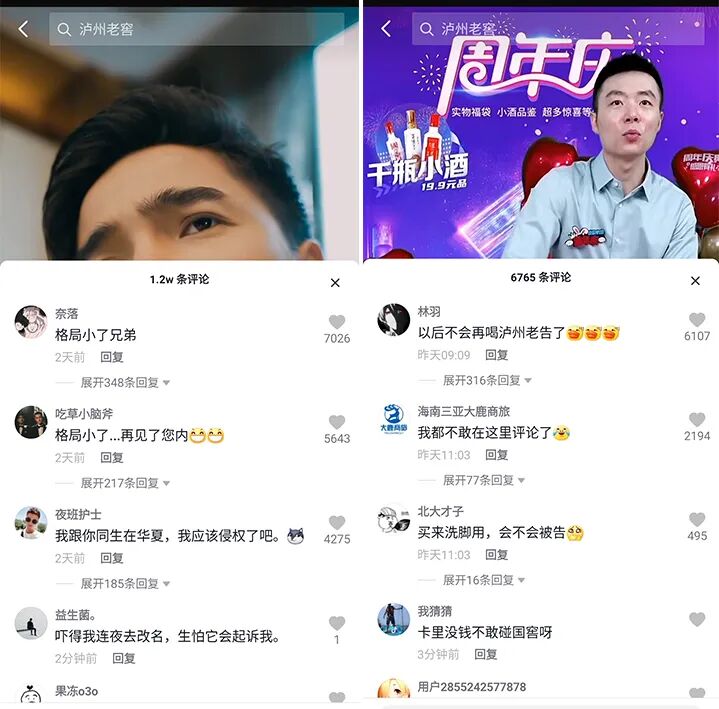 而在泸州老窖的官方抖音号和官方旗舰店抖音账号的评论区也被网友挤爆了,一片调侃与揶揄:格局小了、走到你们泸州会不会被起诉、赢了官司输了人品......