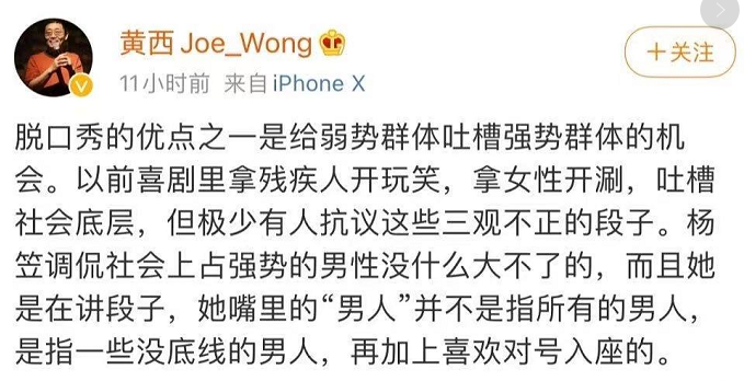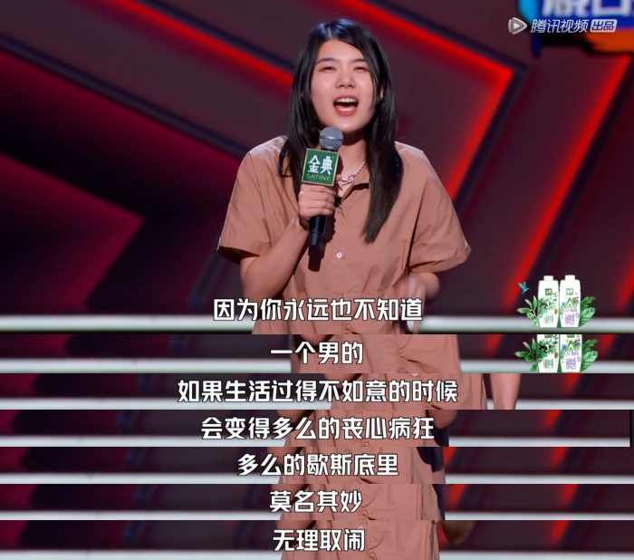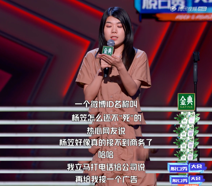 比如庞博的:“奶茶是兑了水的粽子”;又比如杨笠的“不要轻易地调侃男性,如果非要调侃,只调侃成功的那部分”自去年杨笠那句「他那么普通,却那么自信」段子火爆全网之后,杨笠成为风口浪尖上的人,有人恨她挑起性别对立,也有人爱他说出人间真相。今年,杨笠又来脱口秀大会炸场子了,开场一句“准备好听到一些犀利的男女话题了吗”就吊足了观众胃口。六分多钟的演讲全程高能连爆四灯,随即登上热搜第一,又一次掀起网友激烈讨论。这次脱口秀,杨笠不但没退缩,反而更勇了,网友直呼杨笠“杀疯了”!去年因为杨笠调侃男性而遭到广大男性谩骂,所以今年杨笠称这一年学到的最重要的道理就是:“不要轻易调侃男性,如果非要调侃只调侃成功的部分”。这句话既像是认怂,又像是内涵了会骂他的男性网友,都是不成功的那部分。换言之,不是所有男人都是「普却信」,成功男性是不介意她调侃的。“我就觉得那些听了我的段子不生气的观众,肯定比那些生气的人过得更好,因为一个真正内心强大的人,他是不会那么生气的。”“因为你永远也不知道,一个男的,如果生活过得不如意的时候,会变得多么丧心病狂,多么歇斯底里、无理取闹、莫名其妙……简单来说,就是跟女的一样。”不光调侃了男性,也调侃了女性,“就跟女的一样”,又变成了对女性刻板印象的自嘲。因为惹怒了不少男性网友,有人认为杨笠没资格担任“以男性用户为主”的英特尔产品宣传者,于是纷纷抵制。调侃那些骂她冲掉她代言的人就跟前男友一样,督促自己想偷懒时努力干活,就是要证明给他们看,自己过得很好。“如果有一个男的现在想娶我的话,应该只是想打我的时候更方便。”这里她将家暴的社会问题写进了段子。这种自嘲,其实是在讽刺社会对被家暴女性苛刻的审视标准。去年,杨笠因为说男人普且信,就收到了众多辱骂,也导致她线下的演出也少了很多,不是没人请,而是担心人身安全问题。“自从我说了脱口秀以后,我冬天出门,再也不觉得冷了,因为我头上扣的,全是帽子。”脱口秀表演也被称为“冒犯的艺术”,在美国,很长一段时间以来,脱口秀一直以「以弱嘲强」的形式,延续着大众对于公共议题的讨论。就如黄西所言:脱口秀是弱势群体的武器,也是弱势群体的艺术。过去喜剧拿残疾人开玩笑,拿女性开涮,吐槽社会底层多了,却极少有人抗议这些三观不正的段子。杨笠的段子,其实并不是指所有的男人,而是没有底线的男人。“她要去跟人杠的地方,变成她的一种力量,后来变成脱口秀的一种武器。”而像杨笠这样的脱口秀演员讨论的,大多都是女性渴望听见的话题,希望女性能得到更平等的待遇。事实上,当女性脱口秀演员在用幽默的方式说出犀利的观点时,总会被用更加严格的眼光审判。有豆瓣网友总结杨笠的脱口秀,实际上是一声沉浸式互动型表演。“她在台上只完成了50%,剩下的50%,靠台下男人的精彩配合,交相呼应。”“我没什么特别受伤的经历,我没觉得我在喷什么人,我也不知道为什么大家看到之后会有那样的想法。”脱口秀本就是用一种轻松调侃的语气来讲述一些曾经发生过的事,从而获得观众的共鸣。 在玩笑背后,需要我们思考的是社会现象,而不是抓住男女对立问题不放,来引发更多的两性矛盾。观众看脱口秀时,可以抱着一种更包容、更轻松愉悦的心情去看,大可不必上纲上线。