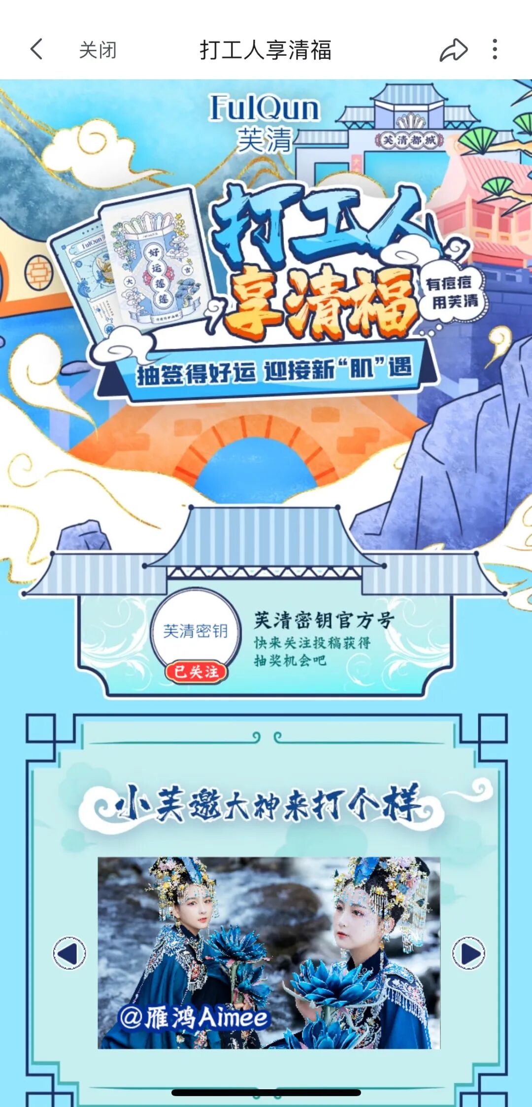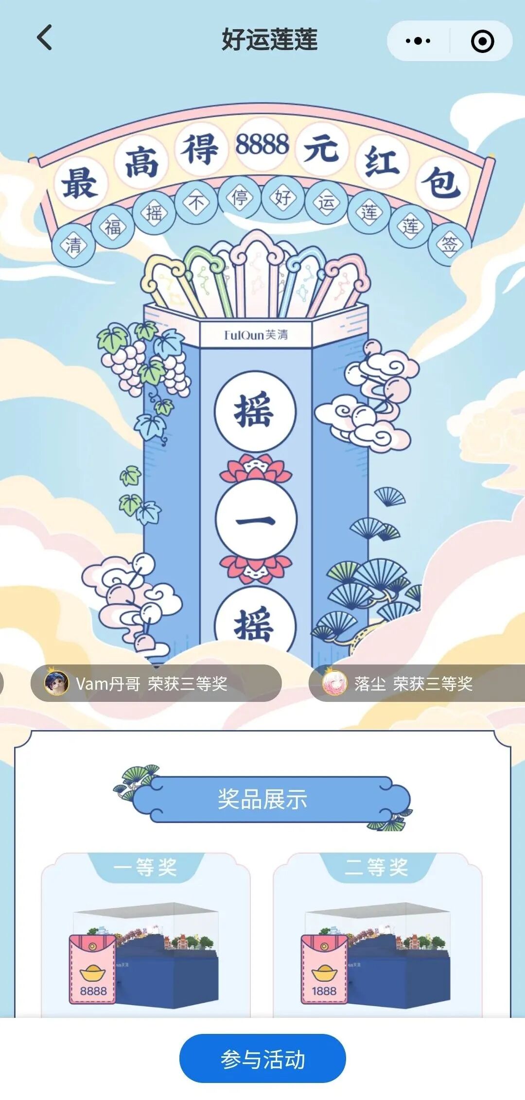 同时在品牌官方微信,芙清还推出了小程序抽奖“送清福”活动,通过抽签游戏的方式将最高8888元现金及凉茶礼盒,在多重奖品福利和social玩法的双重刺激下,引发用户参与交互、沟通,切实撬动用户深度参与。