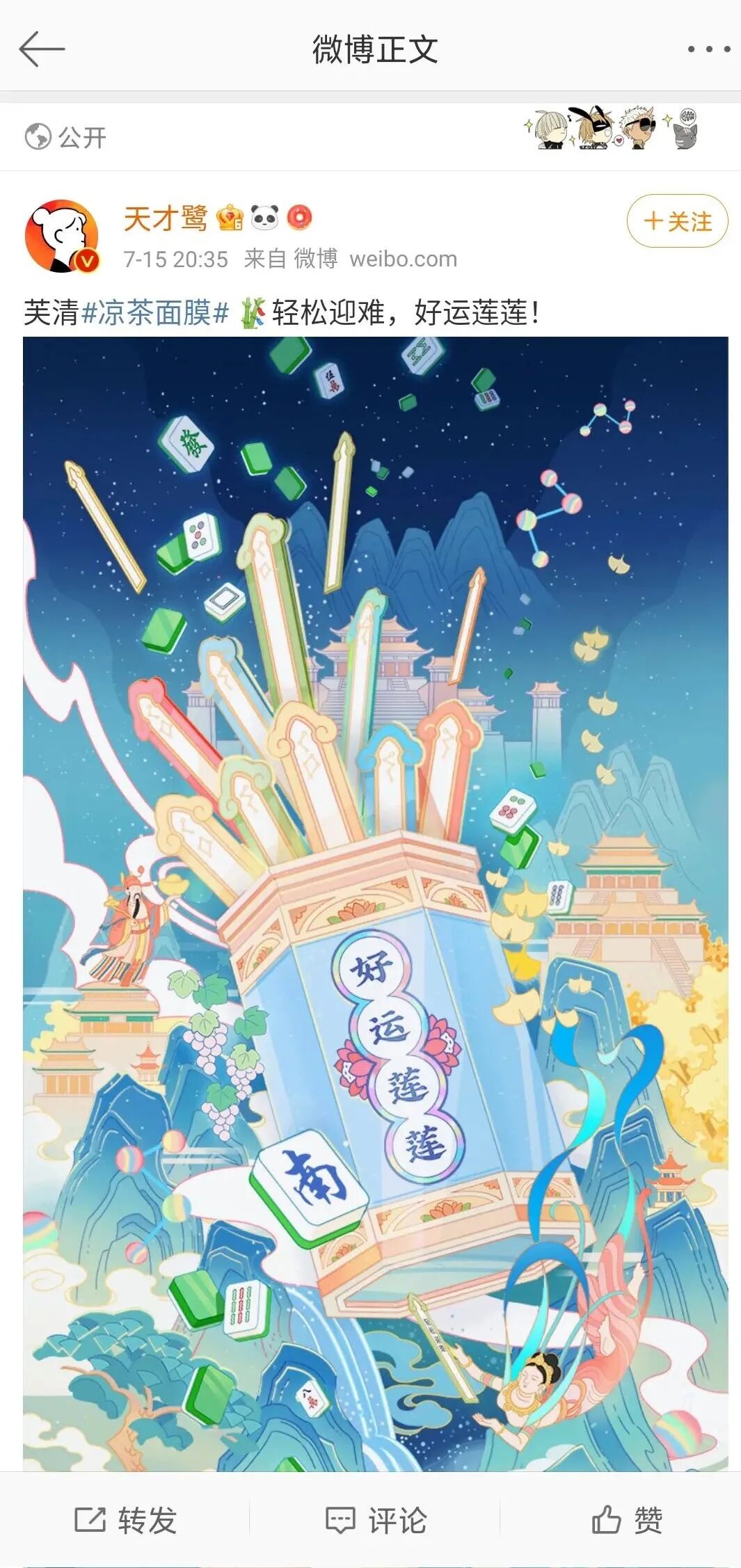 通过拥抱国潮新风尚,在一步步的探索之中,芙清凉茶面膜用自己的创新性玩法向行业展现了护肤+国潮的可能性,不仅彰显了品牌制造话题和热点的能力,同时也实现了品牌传播路径的可复制化与产品概念定位的差异化。