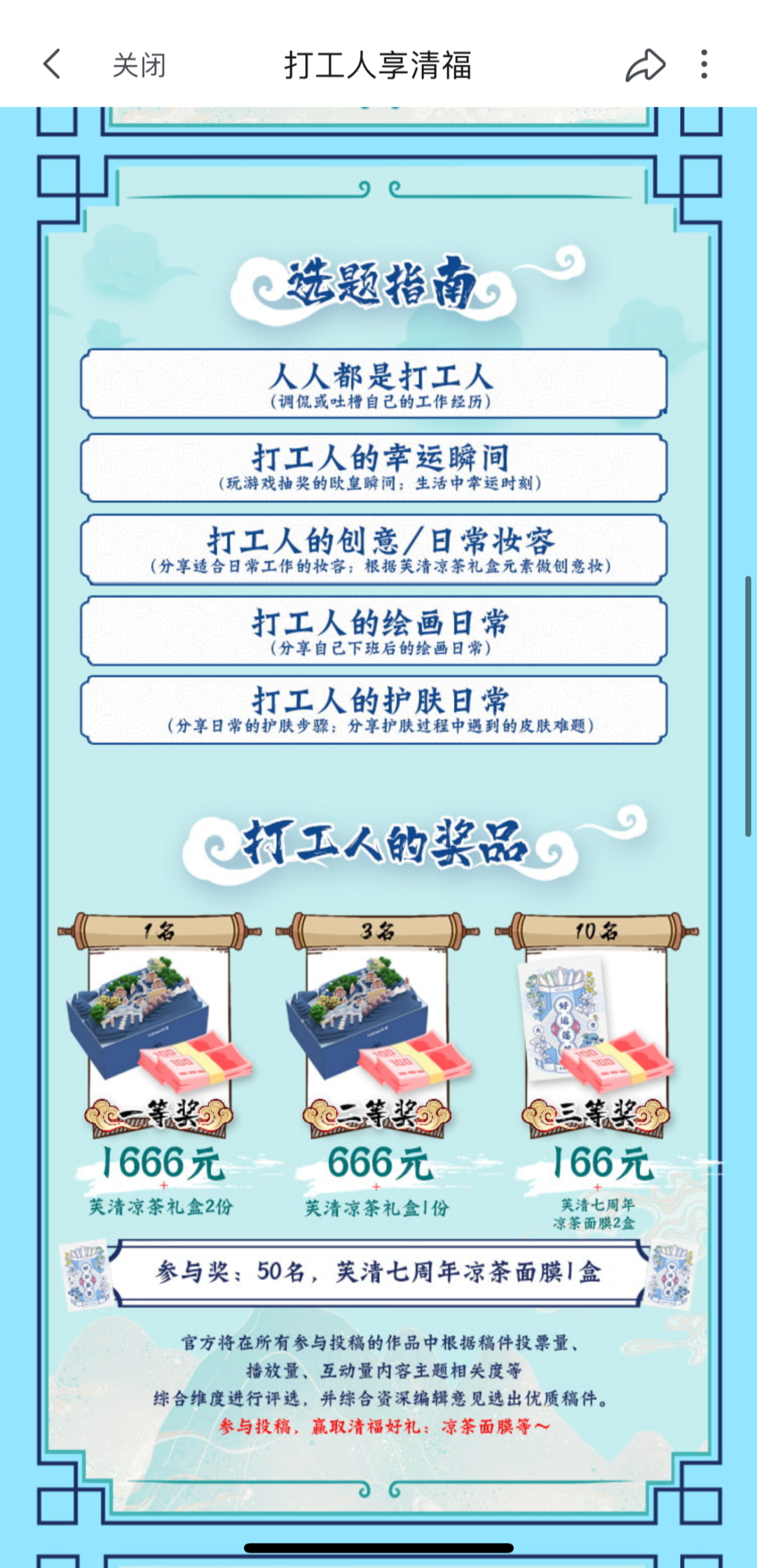 先来看线上,面对当下打工人被无处不在的压力包围的现状,芙清凉茶面膜率先在微博端发起了#打工人享清福#的social话题。话题中无论是芙清送福的美好寓意,还是芙清凉茶面膜给肌肤带来的清凉感,亦或生活清闲如意的祝福都有效戳中了“打工人”的内心所想,不仅赋予了话题多元的魅力,也充分调动起众多网友和KOL的发声欲望和参与热情。