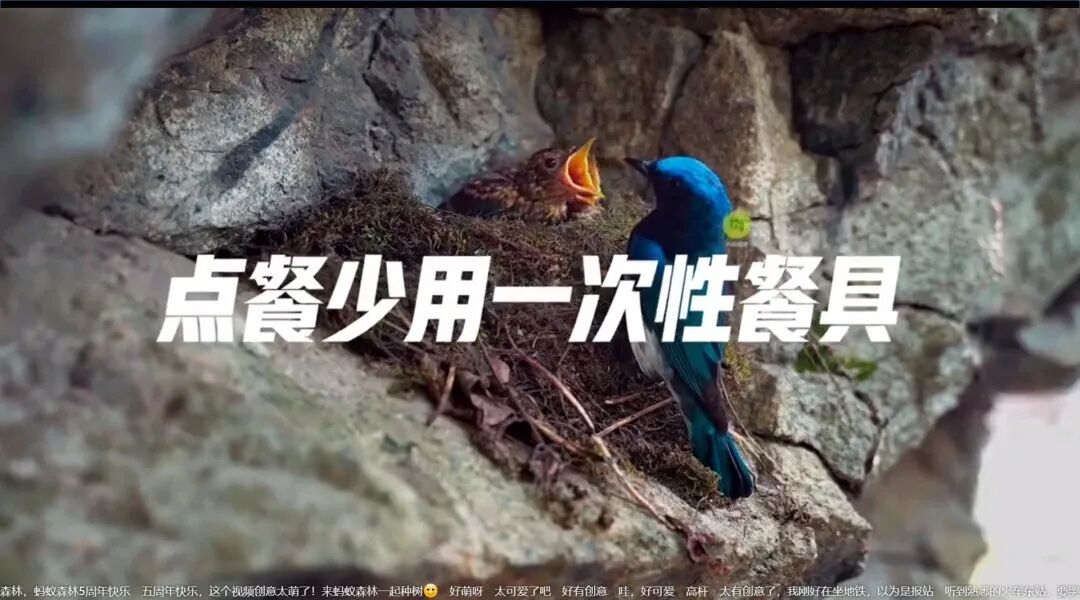 用鸟妈妈将食物送到鸟孩子的嘴巴的画面,呼吁大家点餐少用一次性餐具。