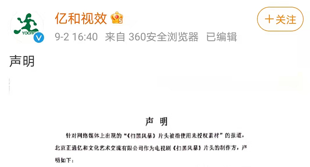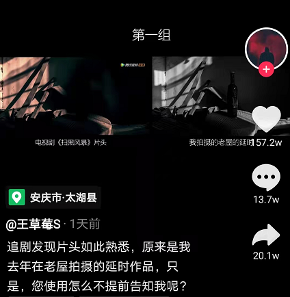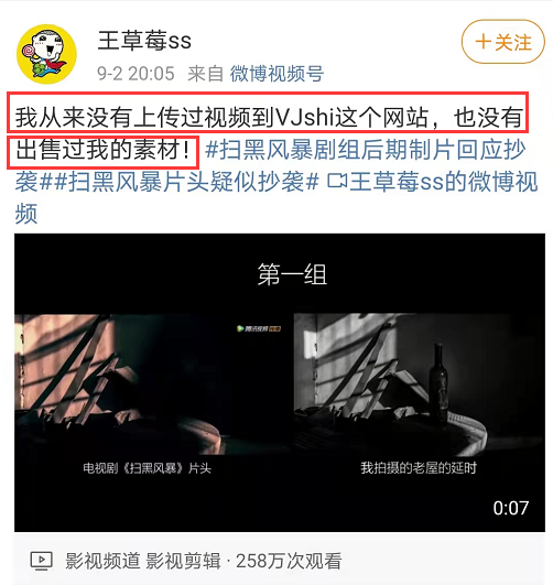 就看最近《扫黑风暴》,凭借扫黑除恶题材和扑朔迷离的剧情刷屏。但这个8、9月对于《扫黑风暴》而言,可真是多事之秋。先是遭遇全集资源泄露,后因为“按顺序解锁剧集”的捆绑销售被喷,这两天又陷入了片头抄袭风波,“扫黑风暴”变成“抄袭风暴”?就在昨天这个事情尘埃落定,罪魁祸首高某终于上线了,让我想到一句话——明明是三个人的电影,我却不能有姓名。起因是一个抖音博主@王草莓S 在网上发声,表示自己在煲剧《扫黑风暴》的时候,居然看到了自己的作品。