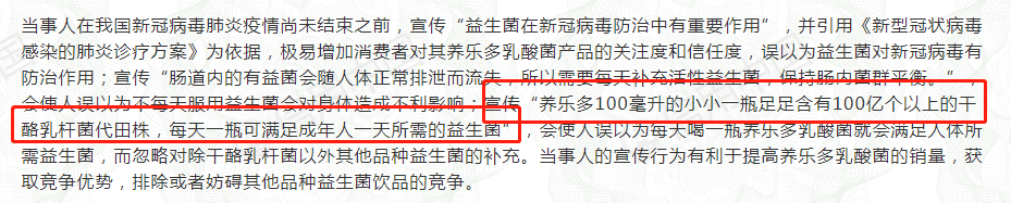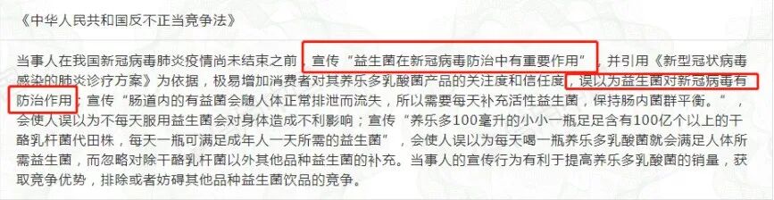 当事人在我国新冠病毒肺炎疫情结束之前,宣传“益生菌在新冠病毒防治中有重要作用”,并引用《新型冠状病毒感染的肺炎诊疗方案》为依据,极易增加消费者对其养乐多乳酸菌产品的关注度和信任度,误以为益生菌对新冠病毒有防治作用。