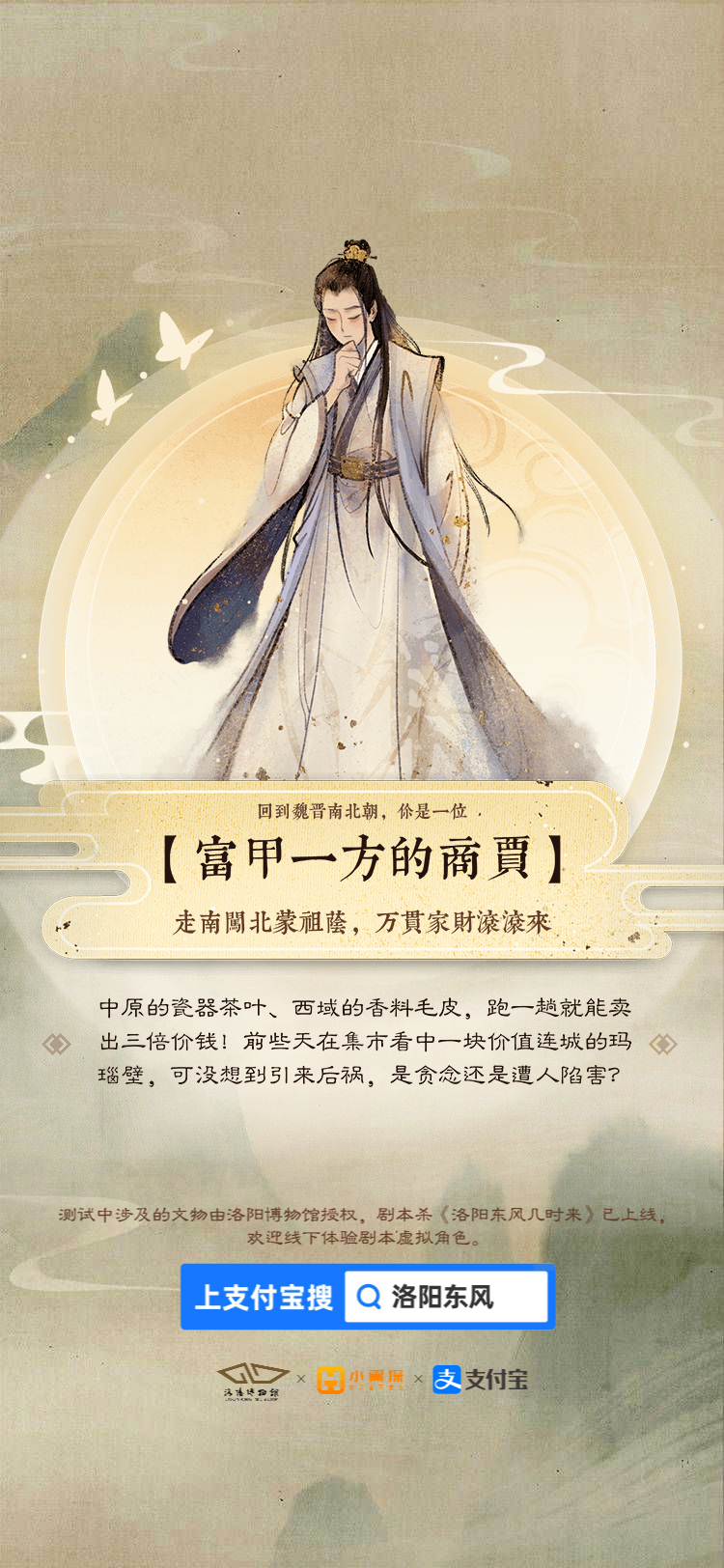 “品牌缺失”问题的解决已经箭在弦上。“剧本杀”的品牌缺失早已是掣肘规模上量的痼疾,仅凭借口碑判断剧本优劣,玩家试错成本极高,间接影响了潜在玩家的参与积极性。试想一下,一场游戏耗时四个小时,选错剧本就是浪费生命。有玩家讲述过这样一段不愉快经历:他和朋友们玩过某一个“最火”剧本,发现剧本人物设置尴尬,情节荒谬,无聊的很。但发现时已经11点,新开一个本不够时间,一个美好的周六夜就此荒废。品牌剧本能够减少玩家的选择试错概率,鼓励更多人参与。除此之外,剧本品牌还决定着商家的实力。一个有知名剧本的店面,可以降低消费者的选择成本,同样可以吸引更多新顾客到店。《洛阳东风几时来》剧本发挥了明显的品牌效应,对目标受众形成了强大的吸引力,许多人是因为剧本决定进店。因为人们通过支付宝的宣发内容介绍以及用户自发的玩本体验分享,,可以判断《洛阳东风几时来》是一个不会令他们失望的品牌剧本。把时间拨回剧本创作之初,创作团队从一开始便确定了“高标准精品化”的产品定位。据作者张森透露,为了严格尊重史实,他在创作过程中,多次向历史专家进行学术请教。在制作方面,高度重视原创保护知识产权。为了保证高级别的视觉体验,美工投入成本高出业界平均水平十倍以上。在支付宝端内穿越测试小游戏的视觉元素中,“晋归义胡王”金印、透雕龙纹玛瑙璧、金狮串饰等设计尤其引人注目,它们均来自洛阳博物馆的文物授权,在近来河南省以国潮文创频频出圈的背景下,来自河南的文物增添了剧本的文化厚重感。此次支付宝×小黑探×洛阳博物馆的联手,是“剧本杀”行业品牌化的方向之一。除此之外,店铺的品牌化也是一个方向,可以预见,随着更多“剧本杀”商家发育起来,有望并存“以本选店”和“因店玩本”等并存的消费动机。