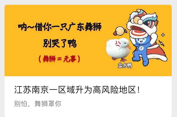 舞狮前来安慰盐水鸭,暖心玩梗“舞狮=无事”。
