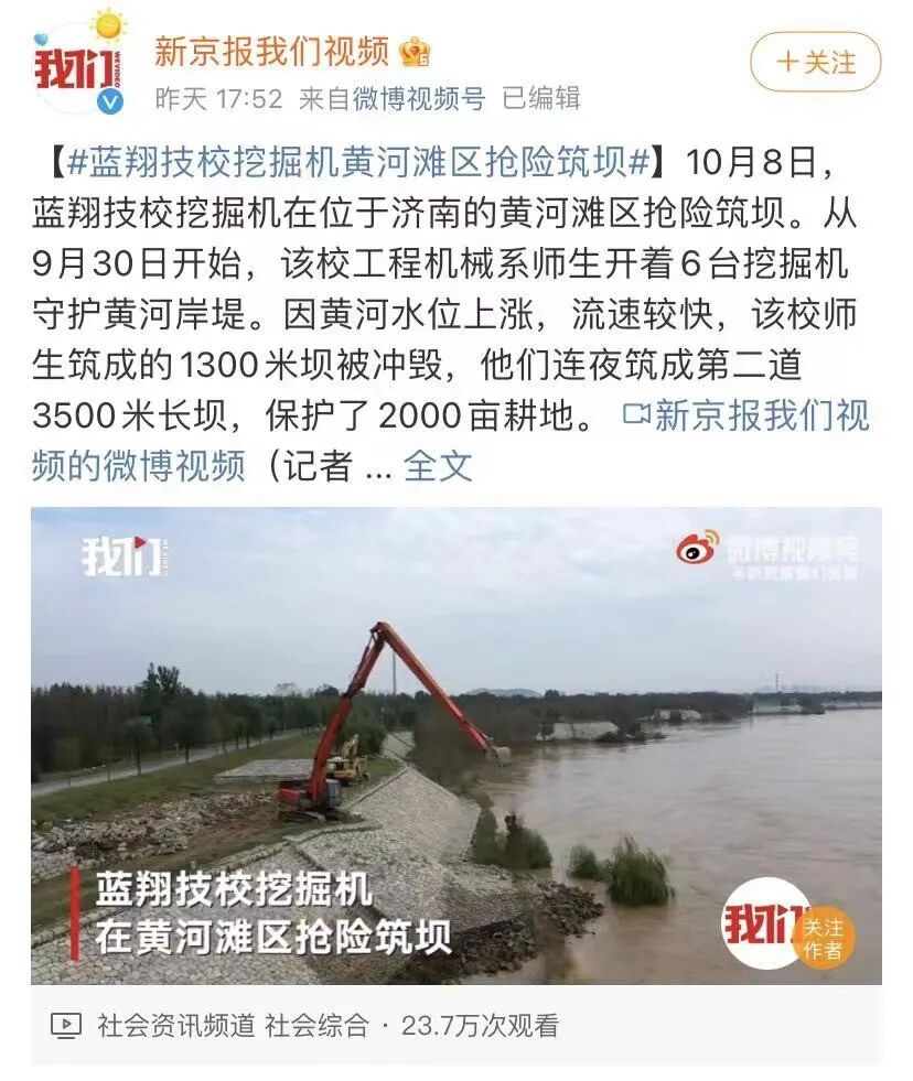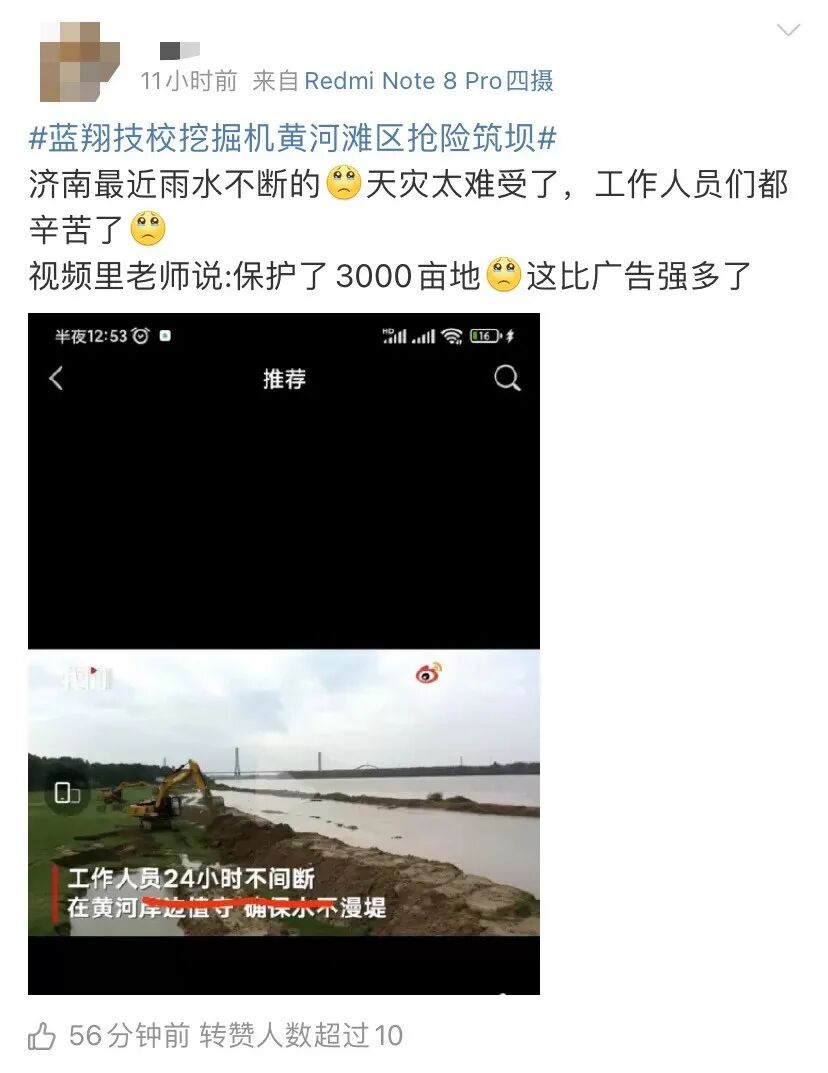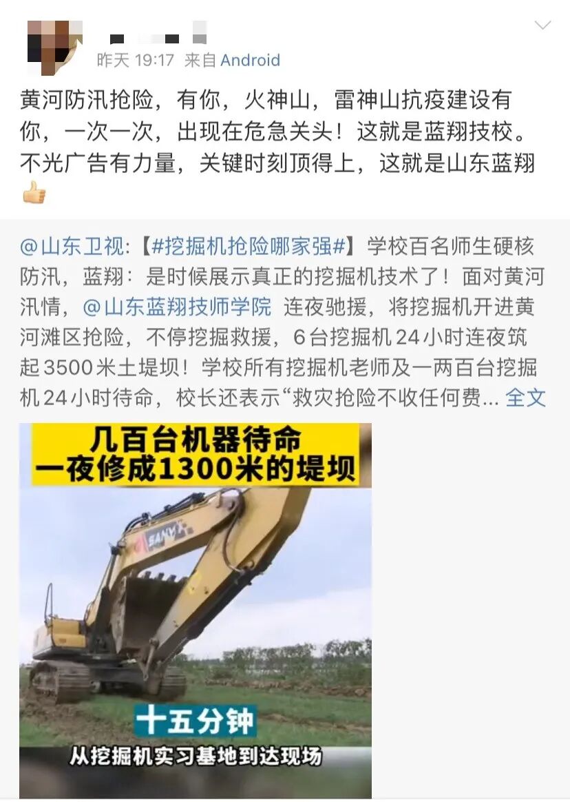 好比这一次,网友们之所以注意到蓝翔上了新广告,还是因为#蓝翔技校挖掘黄河滩区抢险筑坝#的新闻。