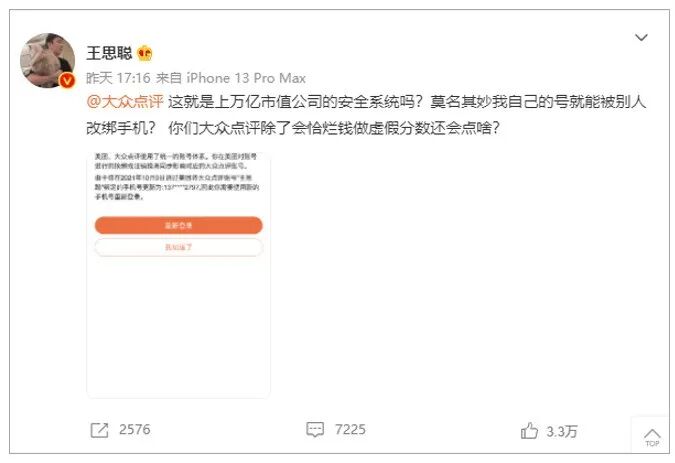这条微博写得言辞激烈:“这就是上万亿市值公司的安全系统吗?莫名其妙我自己的号就能被别人改绑手机?你们大众点评除了会恰烂钱做虚假分数还会点啥?”