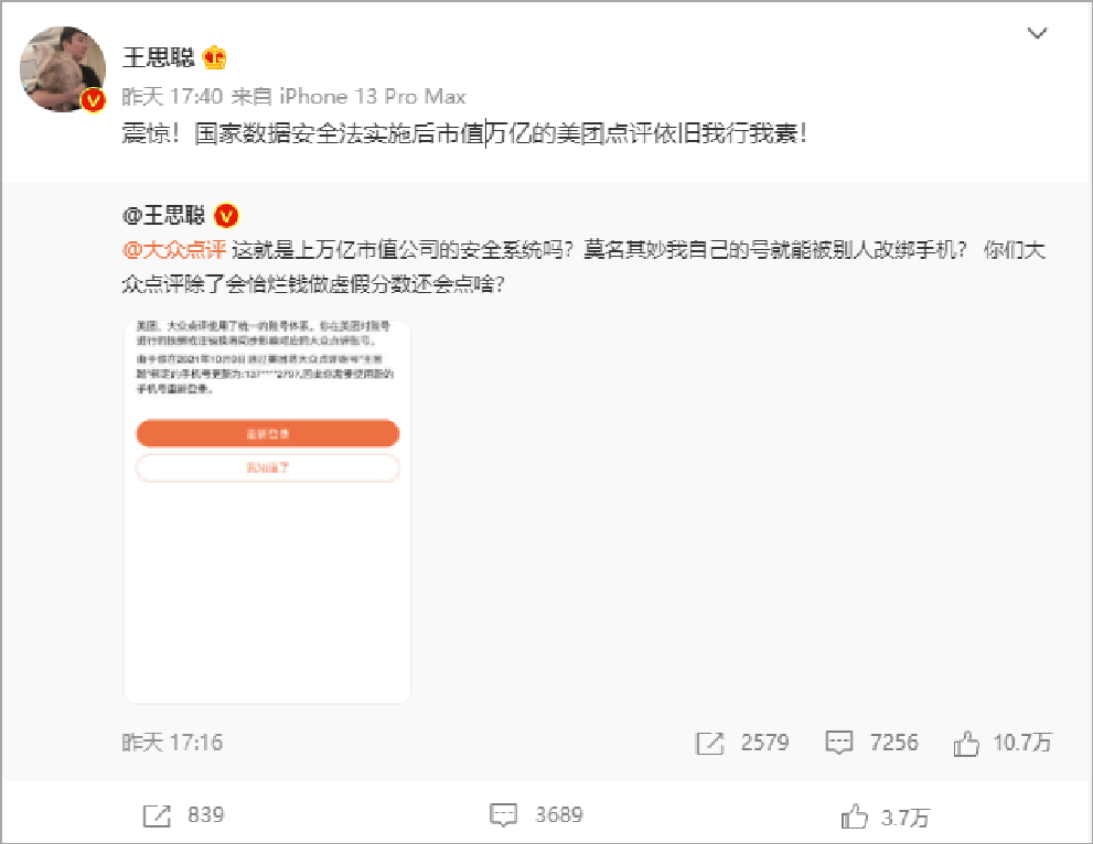 前两天,在王思聪打开大众点评APP的时候,发现自己竟然被盗号了。校长当时怒从心头起,直接微博开撕大众点评。