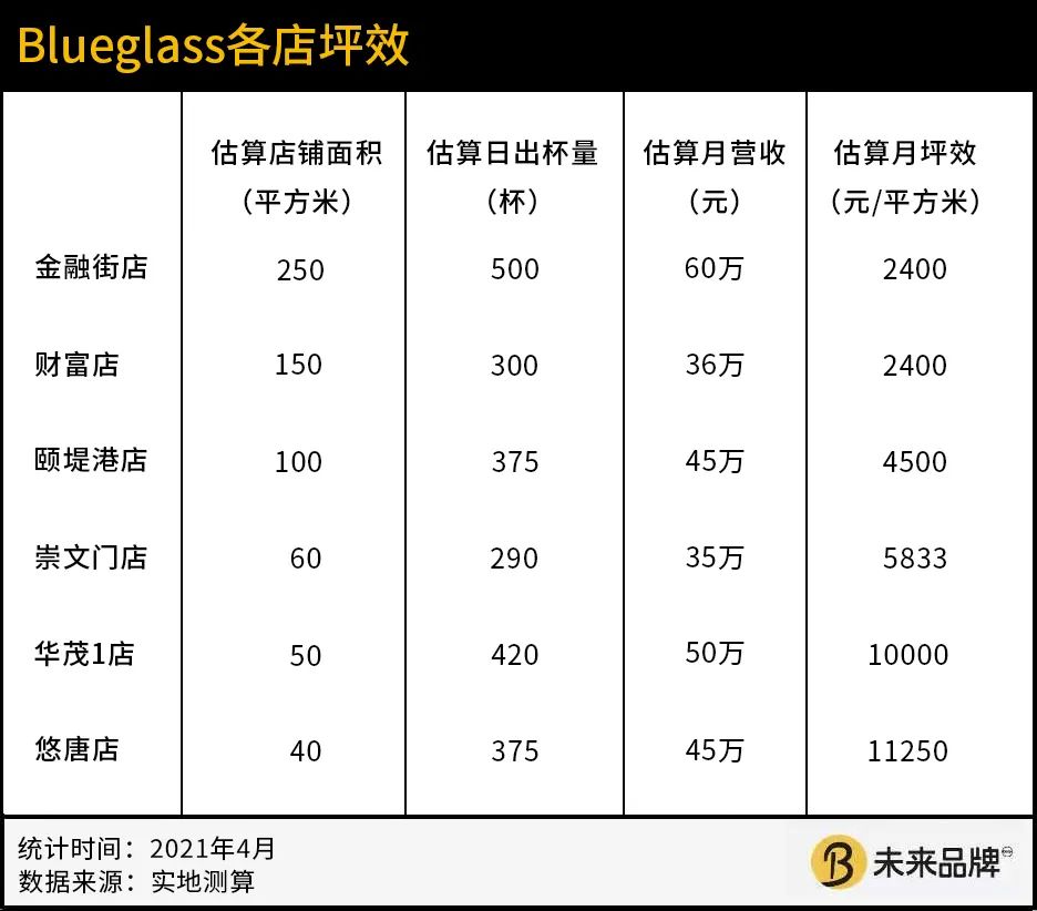 这样算下来,忽略折旧,Blueglass的毛利率大概在45.4%。我们对其他4家门店也做了类似的成本估算,毛利率也在40%-45%的区间。如果我们将Blueglass和奈雪对比,我们会发现,Blueglass的成本结构和毛利率都要更加优秀。跟据奈雪的招股书,奈雪的材料成本占总销售额的38.4%,租金12.1%,人工28.6%,包含水电在内的「其他租金及相关开支」3.1%。毛利率仅17.8%。所以,Blueglass之所以这么贵,比起成本高企,更主要的原因在于有消费者愿意买单。Blueglass的门店大多位于诸如北京金融街中心、蓝色港湾高端写字楼或中高端商场里。据我们观察,Blueglass的主要消费者是高收入的白领女性,年龄集中在28-40岁。此外,25岁以下的消费者在购买Blueglass时,会花更多时间淘优惠券,以获得更低价格。一部分的消费者会在午饭时间和晚饭时间光顾Blueglass,这也许意味着部分消费者确实有把Blueglass当作代餐食用。40元一顿午饭/晚饭,对于白领们,还是有较高接受度的。Blueglass是一个有人买单的生意,但资本更需要的是一个能做大的生意。线下酸奶店是否是酸奶行业的又一次消费升级?我们认为答案是否定的。「从1.0传统酸奶,到2.0预包装酸奶,再到3.0高品质现制酸奶」的资本故事,可能更美好:Blueglass可以把1900亿的酸奶市场作为自己的潜在市场。但是,超市里售卖的包装酸奶大概率不是Blueglass的竞品,两者的价格没有可比性,消费场景的重合度也非常低。这种激动人心的故事新茶饮公司也曾讲过。他们的潜在市场规模,曾是4420亿的茶饮市场。当喜茶和奈雪的茶跑出来后,大家开始意识到,这些线下新茶饮和传统茶饮完全不是一个市场,规模很大,但绝对不是4420亿。Blueglass真正的竞品,其实是喜茶、奈雪这些线下饮品品牌。虽然新茶饮市场目前也超过了千亿规模,但比起消费升级,在极度内卷的线下饮品赛道里竞争就没有那么性感了。40元一杯的线下饮品店,面临的困境显而易见:客群很可能会限制在金融街的高收入女性里。而资本关心的是Blueglass是否能够规模化,是否能够开500家,甚至10000家店。包括新茶饮在内的线下店,可以被初略地分为流量生意和租金生意。流量生意的特点是:对点位流量高度依赖、看重坪效这一「竖」。奶茶品牌「一点点」就是一个流量生意:它的选址通常是在大学生、上班族人流量大的地方;不提供或者只提供极少的客座空间,以提高坪效(营业额/平方米)。一家「一点点」门店是否能赚钱,高度取决于选址本身的流量,因为「一点点」本身并没有吸引流量的能力。流量生意,讲究尽可能多地进入到大流量池,并把坪效做到极致。租金生意的特点是:对点位流量依赖度低、看重可扩展性这一「横」。而之所以能做到对流量依存低,原因不一。可能是品牌力或产品力强,酒香不怕巷子深。也可能是门店本身提供了常规业务外的额外价值,让顾客愿意特地前往,漫咖啡就是一个典型。跟前辈星巴克一样,漫咖啡同样强调空间体验。一提到漫咖啡,都市白领第一印象就是开阔、安静又主题各异的室内环境。尽管人均消费高达50元往上,漫咖啡不需要跟「一点点」一样,将自己局限于目标客群流量大的点位。在一、二、三线城市,在中低端商场、居民楼底商、大学、机场甚至火车站,你都能见到漫咖啡。同时,在二、三线城市,以及非中心地段,漫咖啡很容易地拿到低租金商铺,甚至获得租金减免。因此,它可以接受更低的坪效,用低租金反补利润。漫咖啡,跟其他租金生意一样,虽然牺牲了坪效,但更易规模化,也能享受到规模效应带来的好处。尽管不是必要条件,但品牌力对于租金生意的盈利能力至关重要。一方面,它意味着品牌能有更高溢价,即使人流量较少,也能有较高营业额和利润。另一方面,品牌力意味着更强的租金谈判能力,和低于市场价的租金成本。Blueglass的窘境在于,它现在还没有足够的品牌力,更像是一个流量生意,但高端价格限制了其未来的流量规模。Blueglass依托于高端写字楼和商场的高端人群流量,可以获得不错的营收。但问题是,中国有多少个高端写字楼和商场能够让Blueglass入驻?Blueglass又是否能下沉到新一线、二线、三线城市里去?在调研Blueglass多家门店的过程中,我们发现Blueglass重体验的大空间门店和不重体验的小空间门店之间,并没有太大营业额差距。比如约40平米的华茂1店,一天也卖了约420杯酸奶,与日售500杯的金融街店差距不大。其他店铺情况见下表:前文提到,Blueglass目前更倾向于一个流量生意,门店大多位于高收入女性白领的工作地点附近。对于这部分核心客群而言,空间体验并不是第一位,因为快节奏的她们常常买完即走。所以,Blueglass的小面积门店才能达到如此高的坪效。但为什么Blueglass仍然坚持要开出大面积门店,来让自己的总体坪效承压呢?2021年,Blueglass新开的4家门店,面积均大于100平方米。一个可能的原因在于,Blueglass想从流量生意转型到租金生意。只有如此,Blueglass才能横向大规模扩张,讲一个资本都爱听的故事。而就像我们在奈雪的茶、漫咖啡身上看到的,做成租金生意的一大法宝就是提供「空间价值」。首先,空间服务能为Blueglass能帮助拓宽客群。如果Blueglass提供的空间足够舒适,不难想象会有顾客特地前往,办公或聚会。这样,Blueglass的辐射半径也将不再局限于在附近工作的女白领。 Blueglass金融街店是西城区饮品店环境榜第1名再接着,如果Blueglass提供的产品