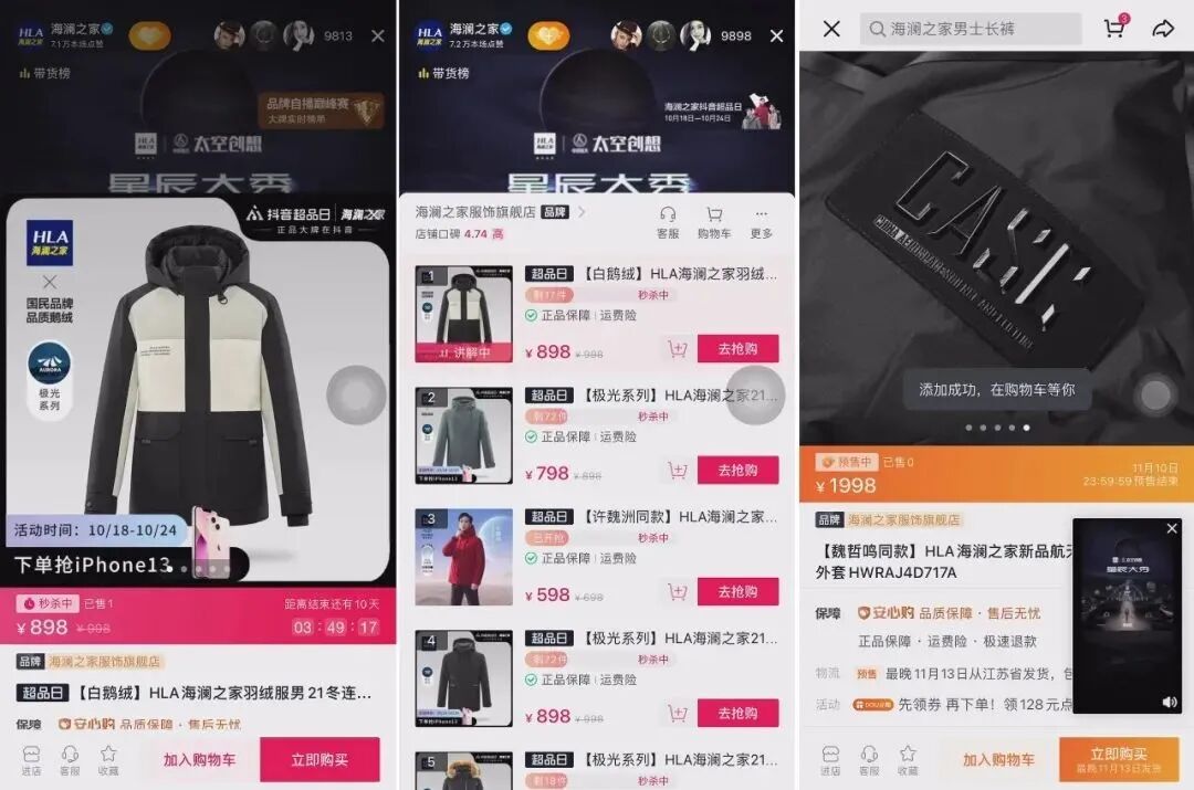 当用户在抖音直播间一边观看 “星辰繁花”大秀时,还能一边购买眼前的同款产品,在直播间内即时完成消费动作。对于海澜之家来说,解决了用户看完即走、搜完即走的痛点,提高了从营到销的效率。
