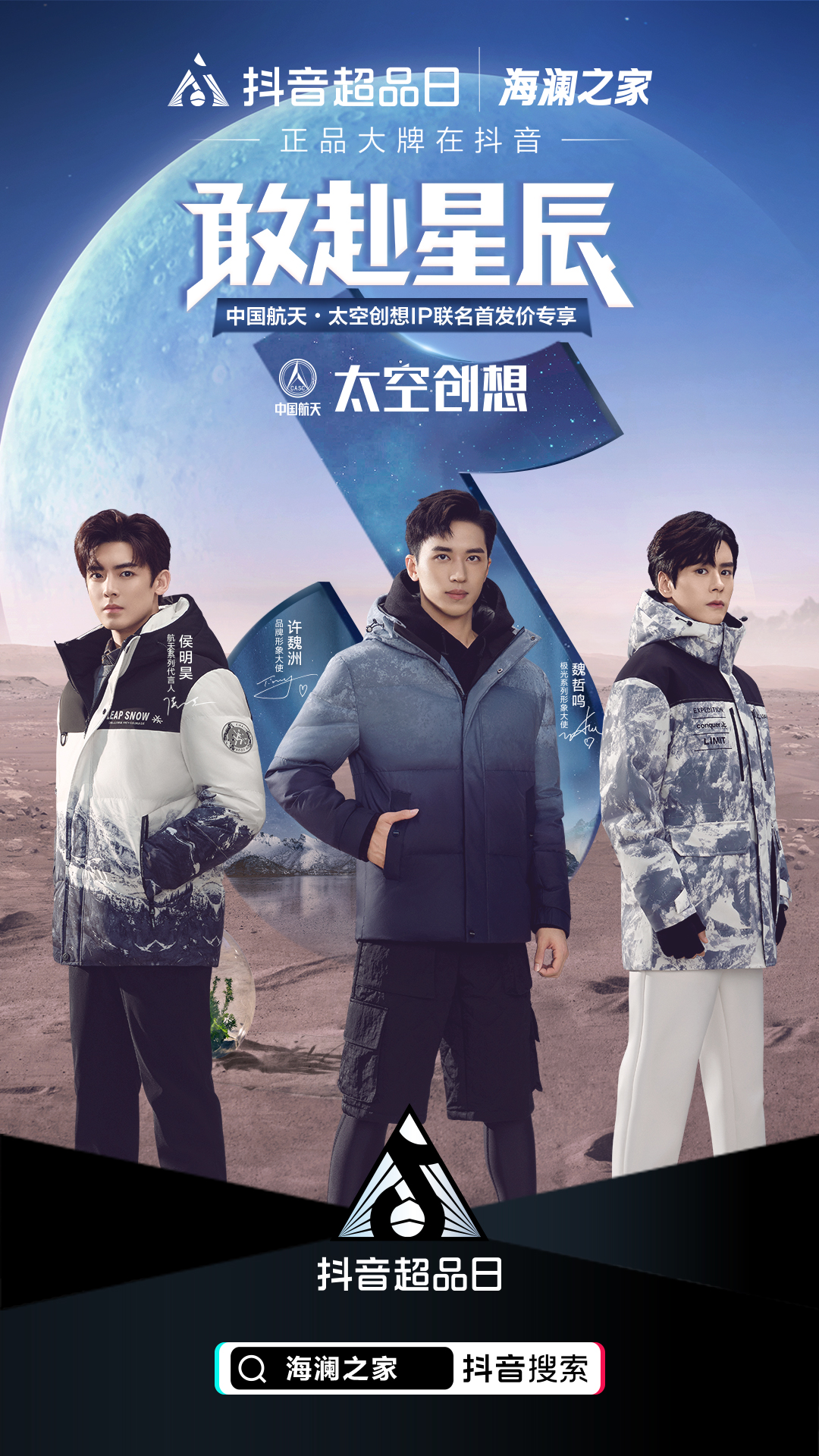 一是体现在创新的营销概念打造上。此次抖音超品日联合海澜之家借势神舟十三号发射成功,顺势而为打造“星辰之子”神秘男团的概念,官宣了三位新生代明星——全新品牌形象大使许魏洲、航天系列代言人侯明昊和极光系列形象大使魏哲鸣,加入海澜之家大家庭;配合代言人明星ID视频和合体官宣视频,进行连续性的预告传播,保证了这场campaign话题走向的持续高能。