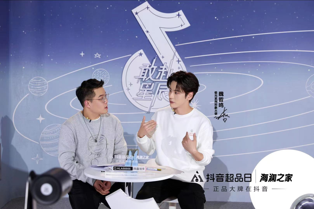 与此同时,抖音超品日x海澜之家联合设计了明星互动的惊喜环节,邀请海澜之家极光系列形象大使魏哲鸣走进直播间,和达人“卡卡欧巴”搭档互动,由明星带流量,达人带货做承接,既调动了直播间的气氛,也激发了用户的购买欲。