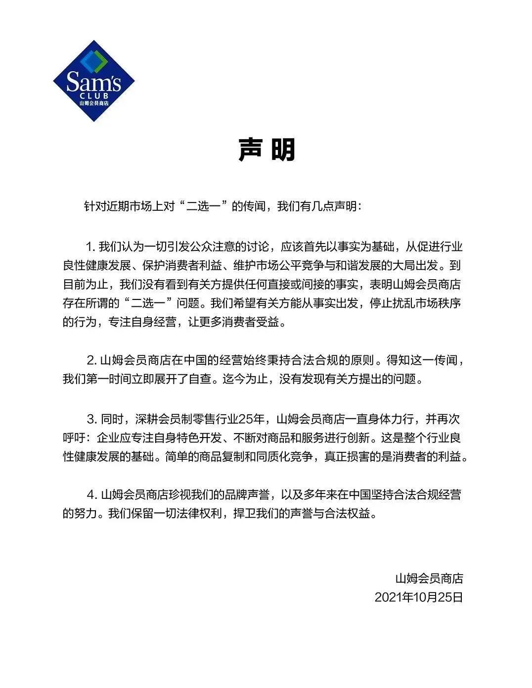 面对日益发酵的负面舆论,10月25日,山姆会员店也发布声明,对近期市场上“二选一”的传闻进行回应,称从未发现此类问题。