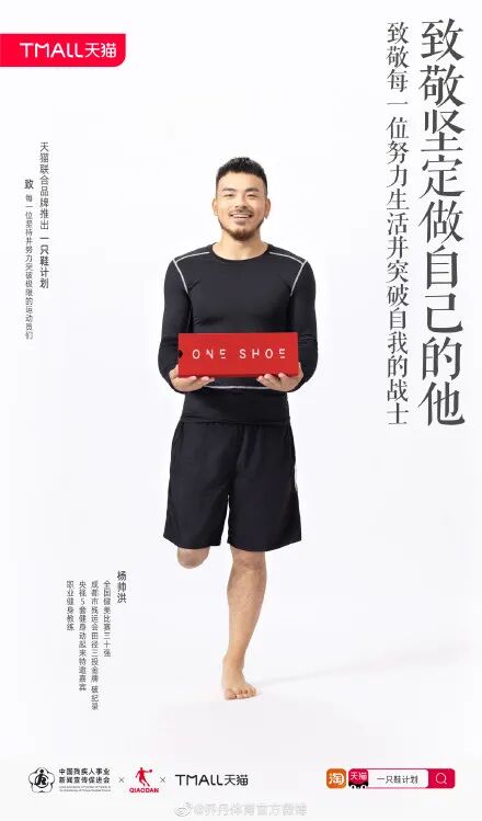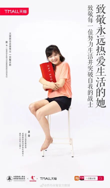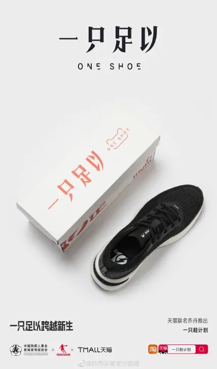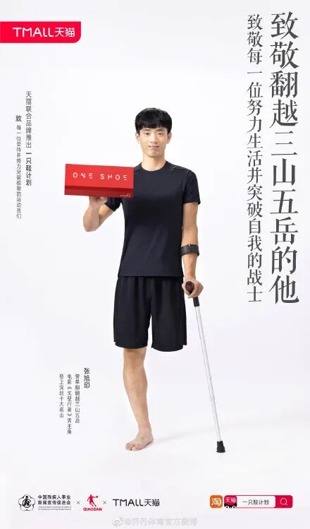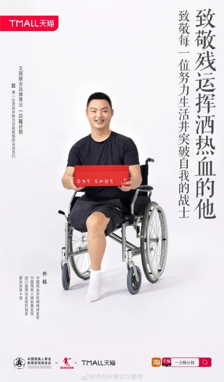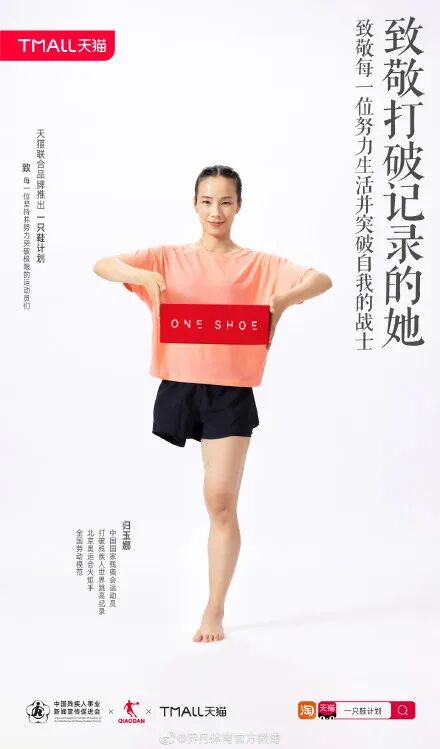 我国有约 2472 万肢体残障群体,他们每买一双鞋就要闲置穿不上的一只。全国第十一届残运会开幕之际,天猫联合中国残疾人事业新闻宣传促进会及 Reebok 锐步、斯凯奇、森马、回力、乔丹、ECCO 爱步、CAMEL 骆驼7家品牌带来一支广告片。片中,山区公益支教老师夏蓉、残运会轮椅网球亚军乔枫、曾单脚翻越三山五岳的张旭印、中国残奥会运动员归玉娜、汶川最美马拉松女孩牛钰、全国健美比赛三十强选手杨帅洪讲述了他们「用一只脚拼搏 却为一双鞋买单」的故事。