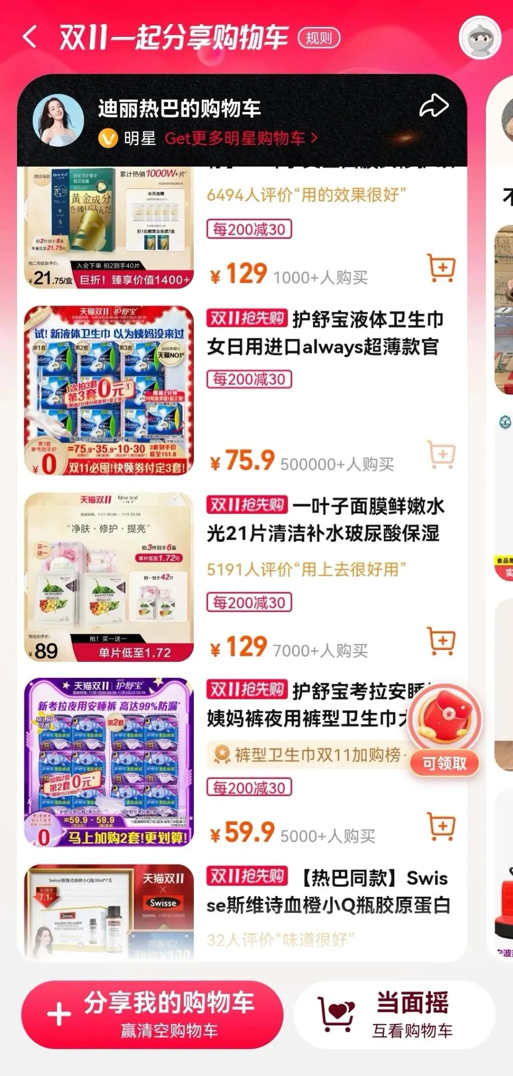 原来,今年的双11前夕,天猫推出了一键分享购物车的功能,蔡徐坤、迪丽热巴等60多个明星分享了他们的购物车。