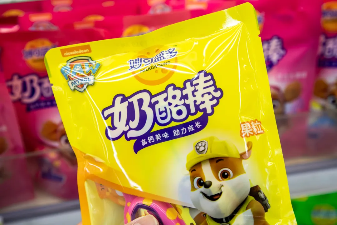 例如妙可蓝多的“汪汪队立大功”系列,妙飞的“超级飞侠”系列,有些品牌的包装甚至直接做成了塑料玩具,把奶酪棒装在“奶牛的肚子”里。