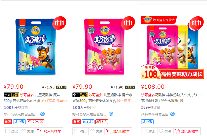 在目前的各大电商平台都可以发现,138元可以购买50个的妙可蓝多奶酪棒和189元75个的百吉福奶酪棒月销量都轻松突破3万袋,按照平均价格来算一只在3元左右,高端产品更是一口下去5块钱。