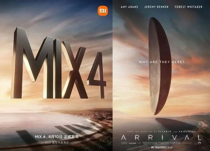 小米MIX4发布预告海报抄袭电影《降临》的海报。
