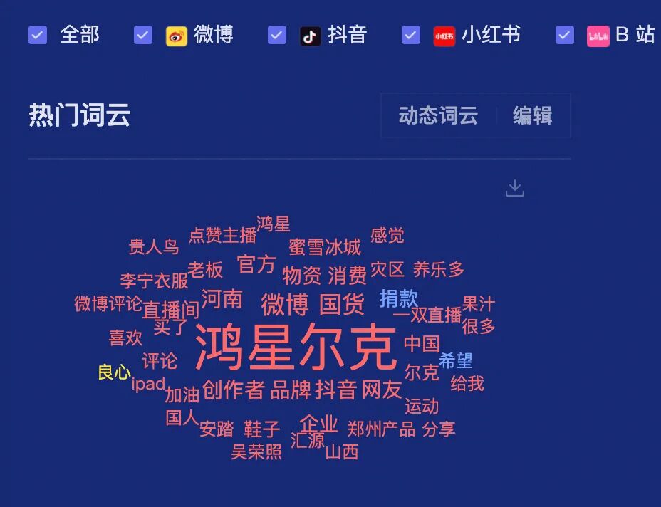 而对于鸿星尔克品牌多平台的热门词云进行检索分析,也可以看出#捐款#、#良心#、#国货#等网友带有社会情感倾向的词语;而缺少品牌、产品、设计、价值观相关的信息,也从侧面说明了鸿星尔克自身的品牌力不足。