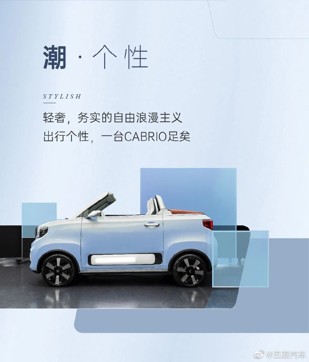 自从打出“人民需要什么,五菱就造什么”的口号之后,五菱品牌形象就逐渐从“国民神车” 走向年轻化的道路。从去年开始的疯狂跨界联名,再到宏光MINI EV马卡龙惊艳亮相,每一步都目标明确的指向年轻群体。而专为年轻人打造的宏光MINIEV敞篷车,更是引爆了年轻群体的关注。这台敞篷车是以宏光MINI EV为原型进行升级的。内饰配色同样简洁大方,两幅式方向盘采用平底式的设计,两侧还配有多功能按键,最亮眼的要数双联屏的设计,令整体空间兼具舒适和科技感。五菱还为这款敞篷车,配备了一键切换的软顶设计,完全不用担心下雨问题。 作为一款前卫的潮玩单品,宏光MINIEV CABRIO将自由浪漫主义设计语言与迷你车身相结合,带来别致的时尚潮感。“海岛蓝”色车身,搭配“日落红”色电动折叠软顶,加上敞篷标志性防滚架以及更具运动气质的双⾊轮毂,满足了年轻消费者对于人生第一辆敞篷车的无限期待。众所周知,敞篷车属于小众车型,许多入门级敞篷车已经退出中国市场,而且敞篷车售价要比非敞篷车贵出不少。五菱宏光敞篷版的到来,无疑给年轻人带来了一个新的选择,相信只要价格能够控制在更多消费者可接受范围内,或将迎来一波新热潮。02
