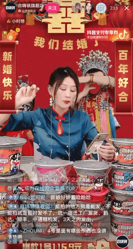 因此,在其抖音首播中,臭臭螺也不安于传统食品品牌的玩法,任性地一掷千金打造沉浸式直播间,剑走偏锋地展现另类行为艺术,执着地把高级感走到底。除了臭臭螺直播间,今年自嗨锅双十一的直播间也非常精彩,让人直呼“城会玩”,直接把直播间布置成了“婚礼现场”,主播也穿着大红喜服,每到整点都会上演一场“闹直播间”,氛围好不热闹。