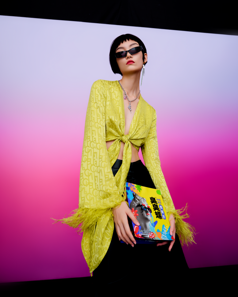 因此,臭臭螺彻底打破了品牌直播的常规玩法。在场景打造上,没有选择常见的简单布景,而是精心打造沉浸式的风格化场景,“臭味相投”扇子、“臭宝”包包,都与“臭臭螺”品牌以及螺蛳粉独特的“臭味体验”相契合。
