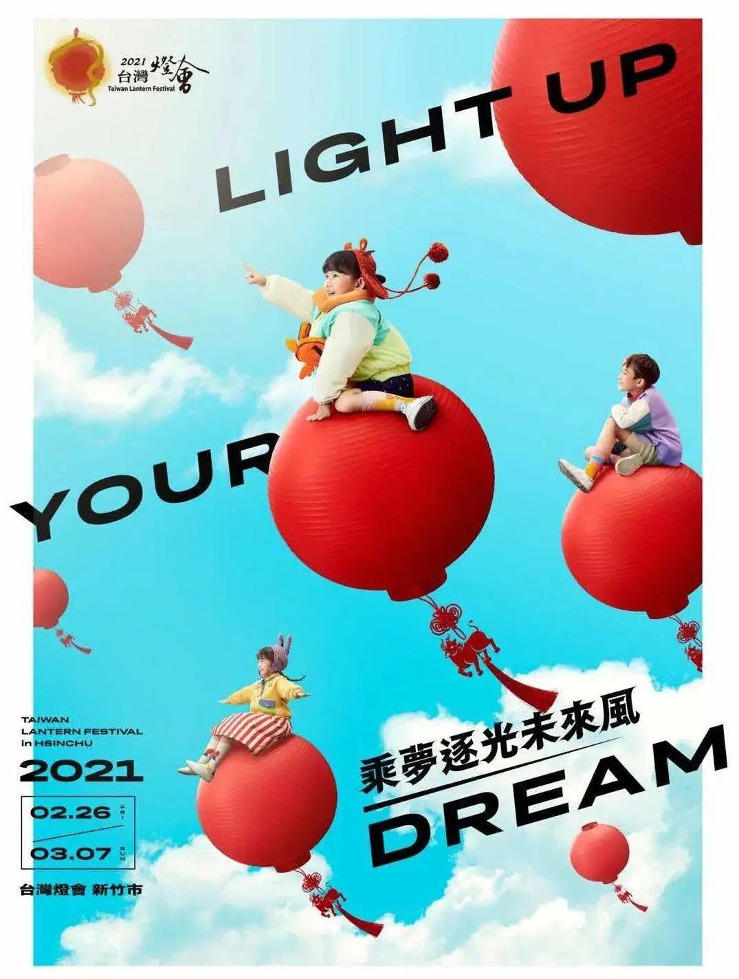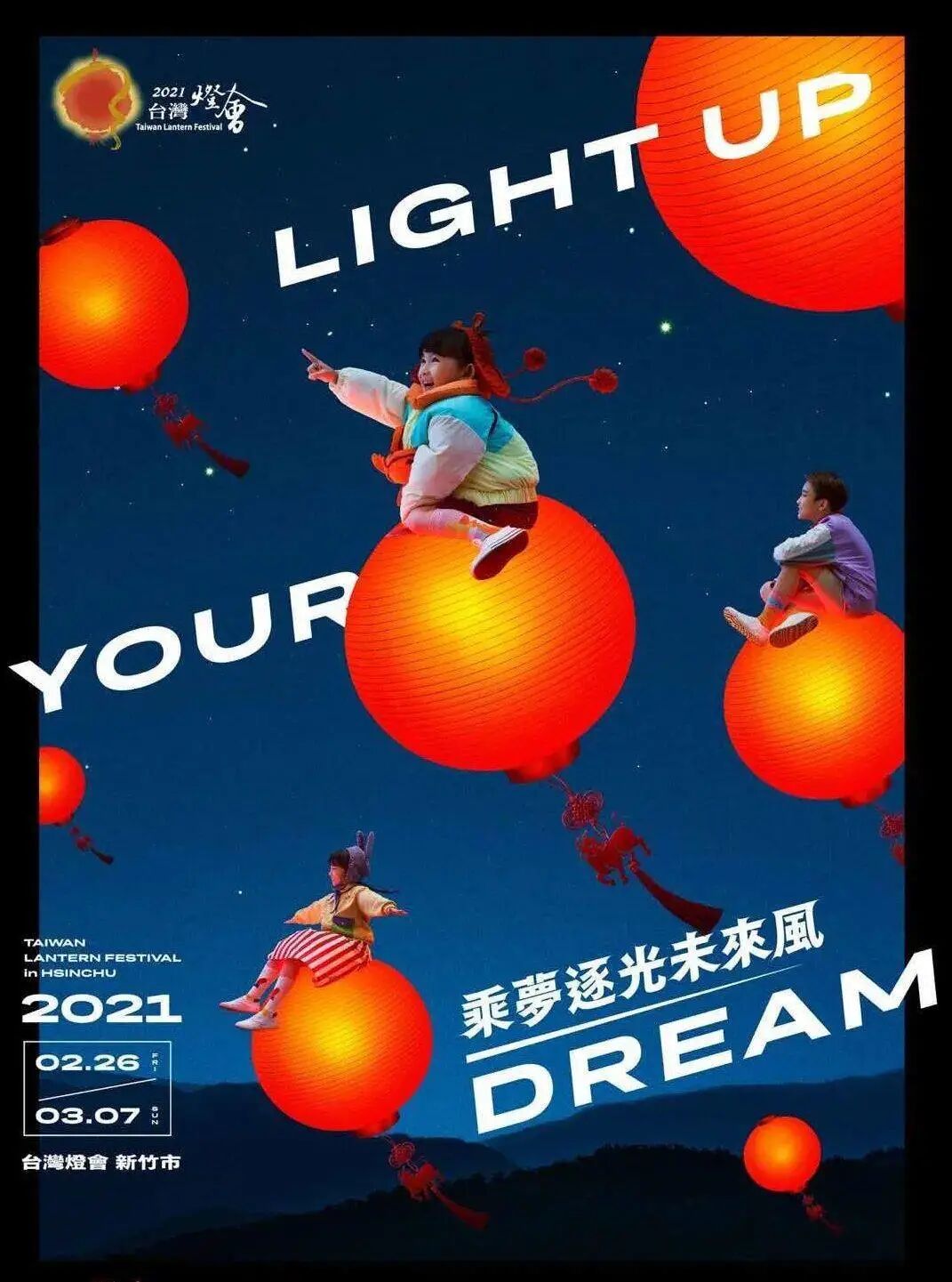 对比2021年台湾灯会“乘梦逐光.未来风”主视觉,由连续4年金曲奖视觉统筹──颜伯骏操刀设计,透过灯笼、孩童、飞翔为三大元素结合,以真实摄影的儿童和虚幻飞翔的灯笼设计结合,带来写实与奇幻的混合情境,呈现有别于以往的设计质感,展现灯会的多元意象。