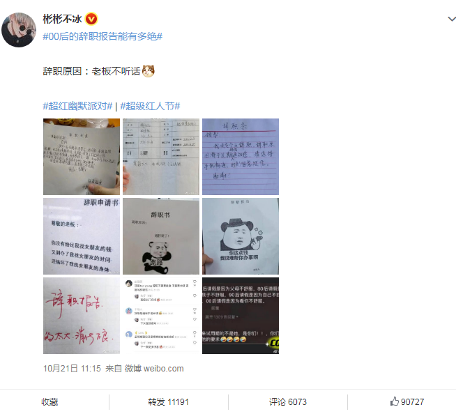 此前微博还有个热搜,#00后的辞职报告能有多绝#,“翅膀硬了”、“饼画的太大,消化不良”、“看领导不顺眼”等各种奇葩理由,可以看出这届00后辞职有多任性。