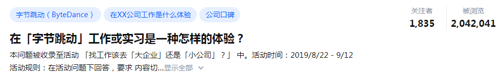 知乎上有个帖子,「在字节跳动工作或实习是一种怎样的体验?」,帖子被浏览了200万次。